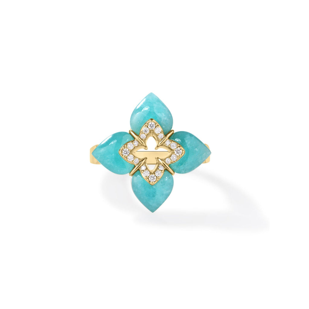 This Roberto Coin Venetian Princess ring features a amazonite centerpiece set in 18k yellow gold, accented by 0.08 carats of expertly crafted diamonds for refined elegance.