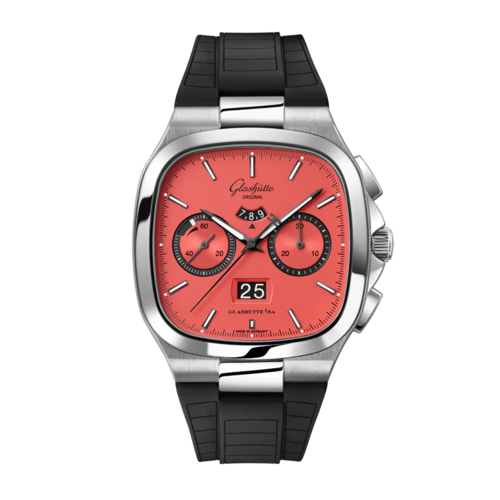 Glashütte Original Seventies Chronograph Panorama Date in a 40.00 x 40.00mm stainless steel case with "watermelon" colored dial on black rubber strap, featuring a flyback chronograph function, power reserve indicator, date display, and an automatic movement with up to 70 hours of power reserve.