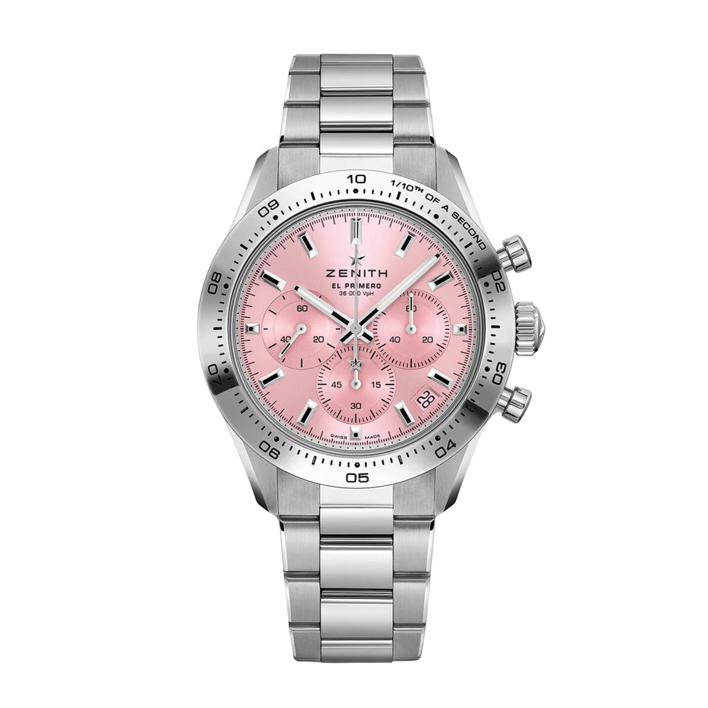 The CHRONOMASTER Sport Pink is crafted in a 41mm steel case with a polished steel bezel, paired with a metallic pink dial and a steel bracelet. Powered by the El Primero 3600 automatic high-frequency chronograph movement with 1/10th of a second chronograph function and a power reserve of 60 hours. Limited edition of 500 pieces.