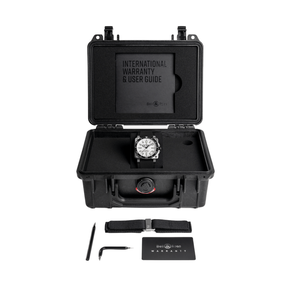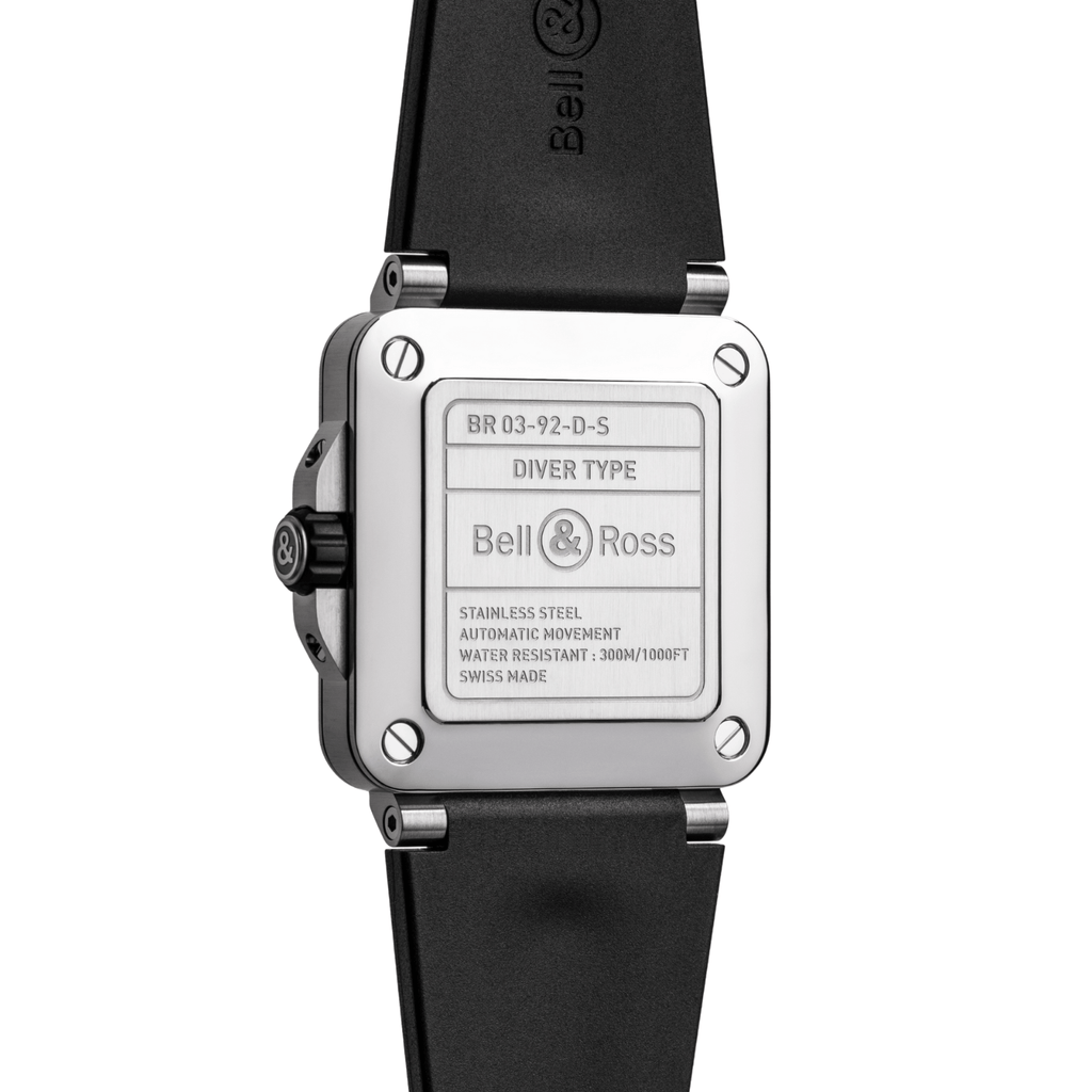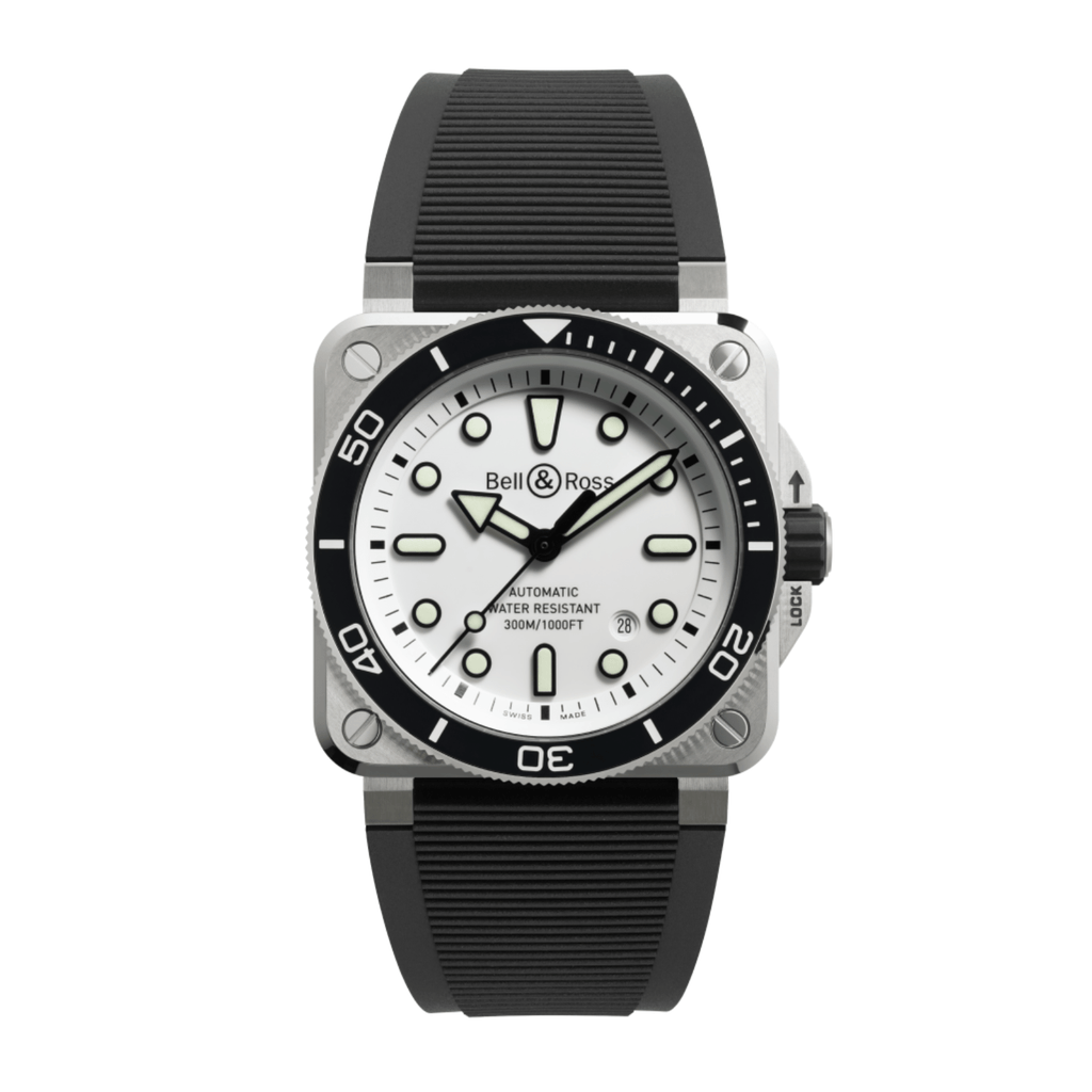 The BR-03 Diver from Bell & Ross, the first square diving watch, meets the international standards governing the designation "diving watch". To mark its seventh anniversary in 2024, the design has been modified for a more contemporary look, and the movement fine-tuned. This watch features a 42mm satin-finished and polished steel case, is powered by the Calibre BR-CAL.302-1. automatic mechanical movement with 300m of water resistance and two straps, one in woven black rubber and the other in ultra-resilient black synthetic fabric.