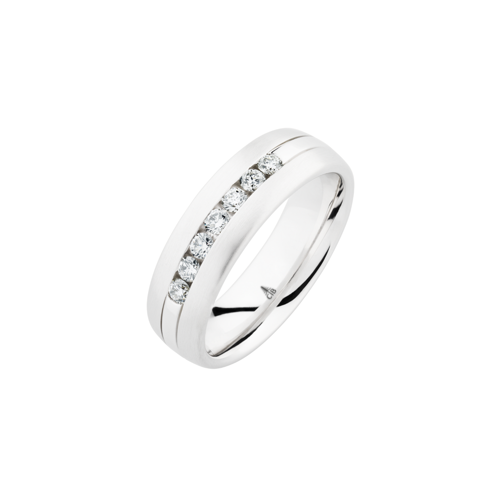 Platinum diamond band, Diamonds totaling 0.31 carat weight. The width of the ring measures 6.5mm.