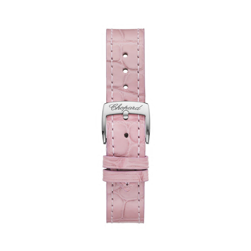 The Happy Sport collection is the emblem of Chopard’s creativity and boldness. Its playful, free-spinning gems, dancing between two sapphire crystals, have captured the imagination since 1993, when Chopard became the first Maison to combine steel and diamonds. Little Diamonds Do Great Things. Chopard Happy Sport in 30mm stainless steel and rose gold case with pink mother-of-pearl dial on leather strap, featuring five moving diamonds and an automatic movement.