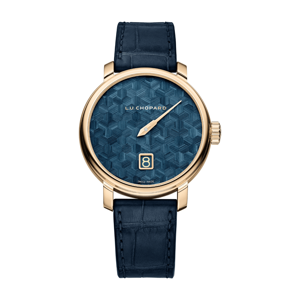 Chopard presents a new edition of its L.U.C Quattro Spirit 25 model, showcasing the Maison’s mastery of both Métiers d’Art and technical innovation. This exceptional creation combines Chopard Manufacture’s jumping‑hour movement with a dial crafted in straw marquetry following a complex geometric motif. This 18‑carat ethical rose gold version features a radiant blue straw marquetry dial and is limited to just eight pieces. The dial pays tribute to a rare artisanal skill preserved within the Chopard Manufacture: straw marquetry. Made from carefully selected rye straw grown in France, each strand is split manually with the thumbnail and then meticulously assembled by hand to form an intricate honeycomb pattern. This design is an homage to the Maison’s founder, Louis‑Ulysse Chopard, who chose the bee as an early emblem for its symbolic values: industrious, honest, and essential to the harmony of the hive. The hive thus becomes a metaphor for the collaborative work at the heart of a Manufacture. A window positioned at 6 o’clock displays the jumping hour with perfect legibility, while maintaining the pure aesthetics of the dial. Powered by the L.U.C 98.06‑L caliber, this edition incorporates a highly appreciated complication—the jumping hour—enhanced by the ingenuity that is characteristic of Chopard. The energy needed for the instantaneous jump is supplied by the exclusive Chopard Quattro technology, which combines four stacked and series‑coupled barrels to deliver an exceptional power reserve of 192 hours. This architecture ensures a constant force to the escapement, stable amplitude, and a high level of chronometric performance. Remarkably thin at just 4.85 mm, the movement is equipped with a Phillips terminal curve balance spring and a swan‑neck regulator for highly precise adjustment. The 40-mm rounded case takes its design cues from the pocket watches historically crafted by Louis‑Ulysse Chopard, reinterpreting their signature curvature in a contemporary form. The transparent caseback reveals the refined architecture and meticulous finishing of the movement, reflecting Chopard’s uncompromising standards of craftsmanship. The timepiece proudly bears the Poinçon de Genève, one of the most prestigious certifications in watchmaking. Reserved for watches assembled in the Canton of Geneva, it guarantees exceptional finishing quality for both the movement and the case.Chopard L.U.C Quattro Spirit 25 in 18-carat ethical rose gold, limited to eight pieces. Features a striking blue straw marquetry dial—each strand of French rye straw hand-split and assembled into an intricate honeycomb pattern honoring the Maison's founder. A jumping-hour window at 6 o'clock displays the time with precision. Powered by the L.U.C 98.06-L caliber with Chopard's exclusive Quattro technology: four stacked barrels deliver an exceptional 192-hour power reserve. The remarkably thin 4.85 mm movement ensures constant force and chronometric excellence. The 40 mm rounded case echoes Louis-Ulysse Chopard's historic pocket watches. Transparent caseback showcases refined finishing. Certified with the Poinçon de Genève, guaranteeing exceptional quality.