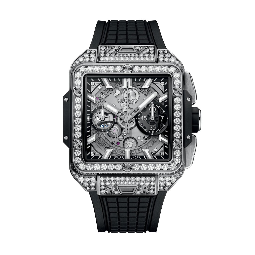 Hublot Square Bang Unico Titanium in a 42mm satin finished and polished titanium diamond case with skeleton dial on black rubber strap, featuring a chronograph function and automatic movement with approximately 72 hours power reserve.