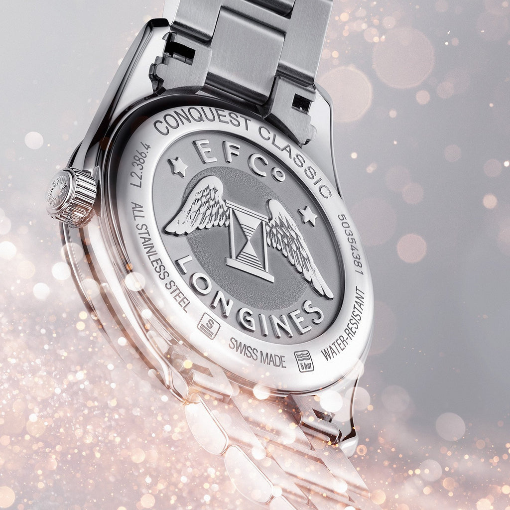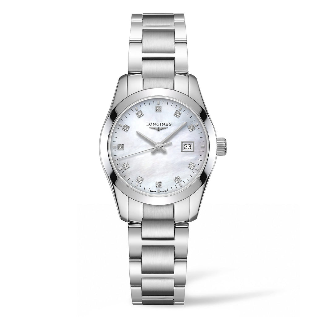 Longines Conquest Classic in a 29.5mm stainless case with mother-of-pearl dial on stainless steel bracelet, featuring date window and quartz movement.
