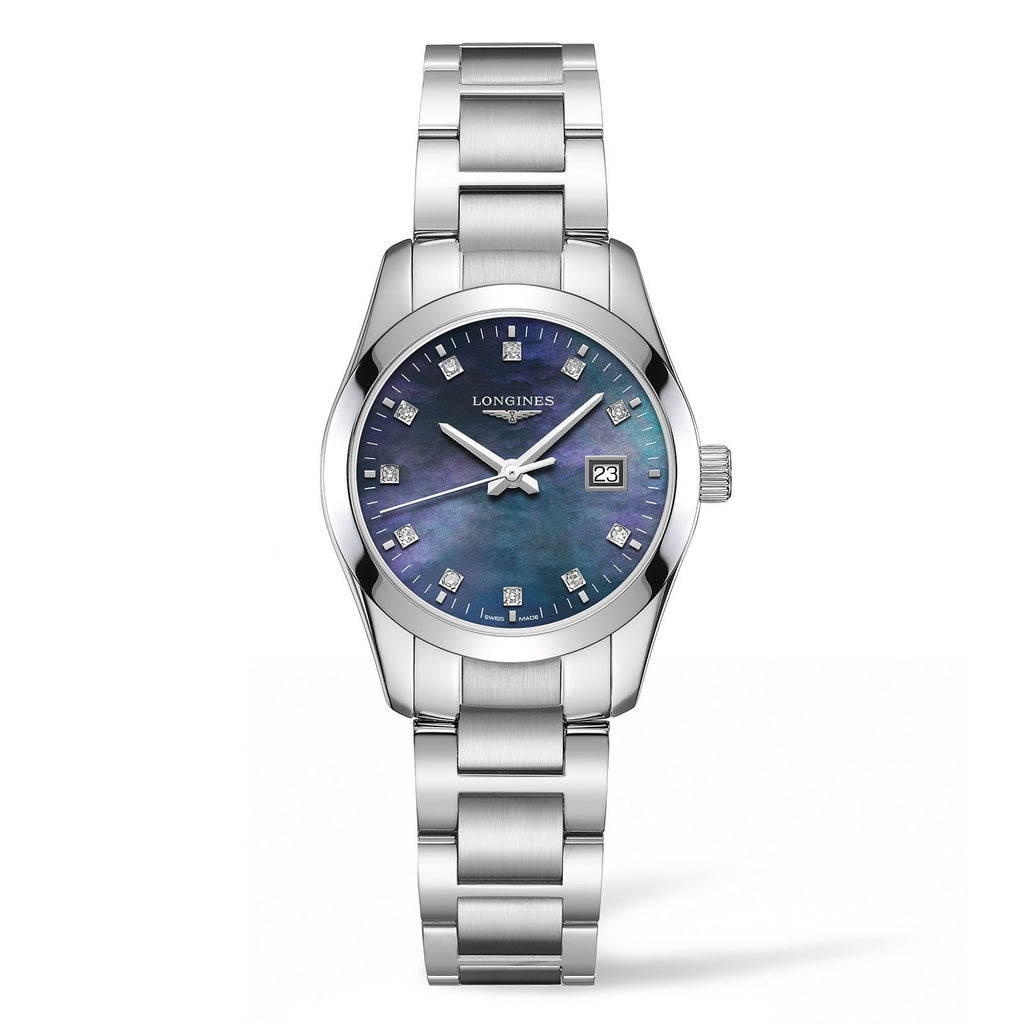 29.5mm stainless steel case, black mother-of-pearl dial with diamond markers. Date display. Quartz movement. Water resistance of 5 bar. Stainless steel bracelet.