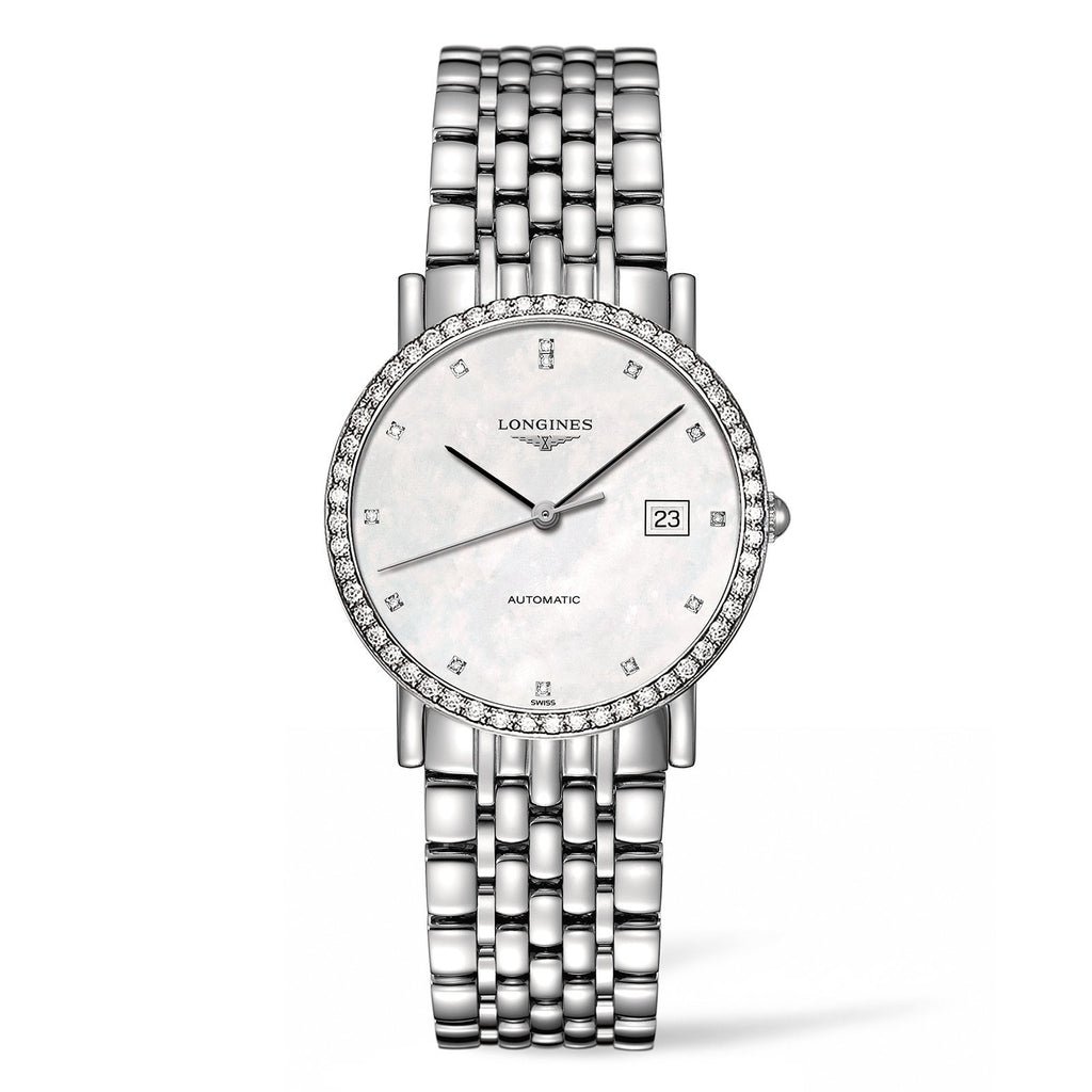 34.5mm stainless steel case with diamond bezel, mother-of-pearl dial with diamond markers. Date display. Automatic movement, power reserve of 64 hours. Water resistance of 3 bar. Stainless steel bracelet