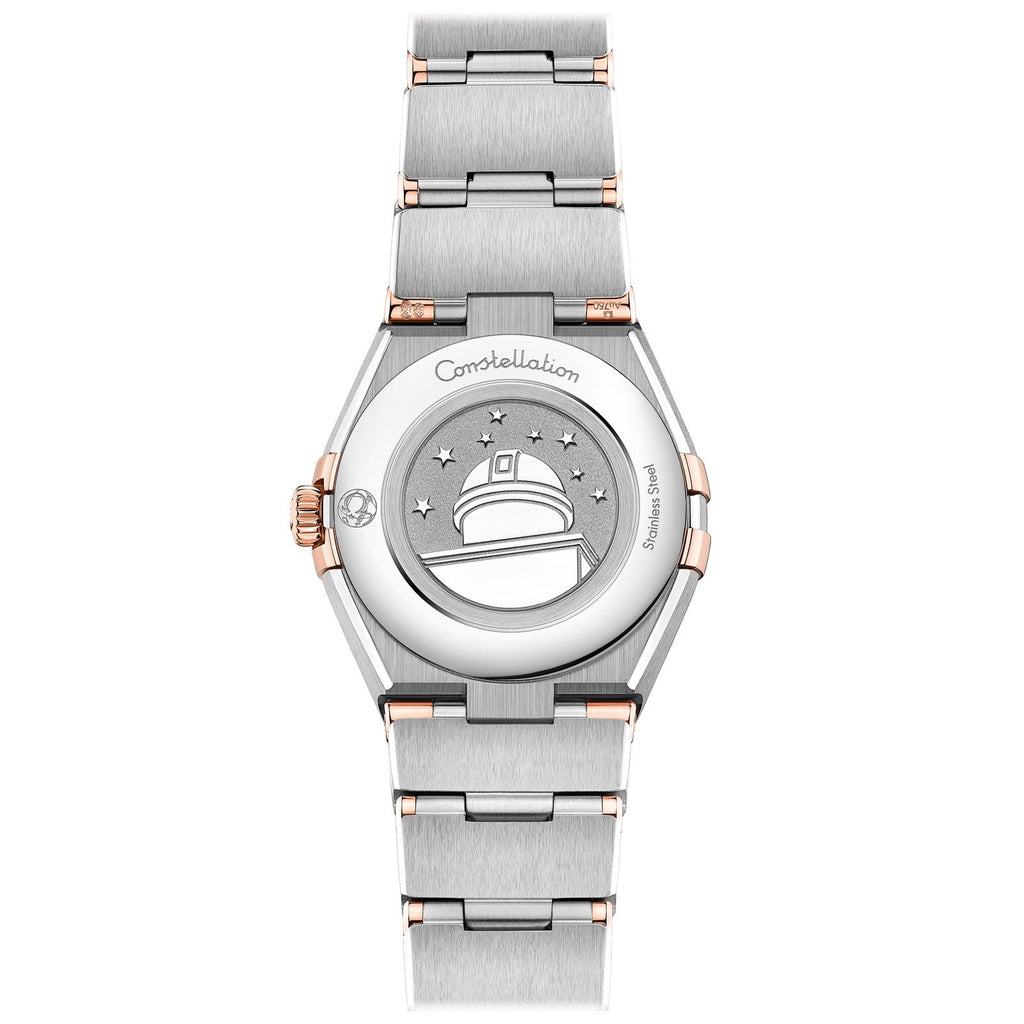This 25 mm 18K Sedna™ gold and stainless steel model features a diamond-paved bezel and a blue aventurine glass dial with diamond hour markers. The hands, OMEGA logo, Constellation star and diamond holders are also in 18K Sedna™ gold.
