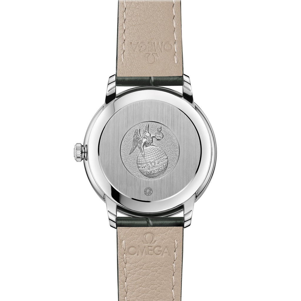 The 32.7 mm case is stainless steel and is presented on a hunter green leather strap. At the heart of this timepiece is the Co-Axial Calibre 2500.