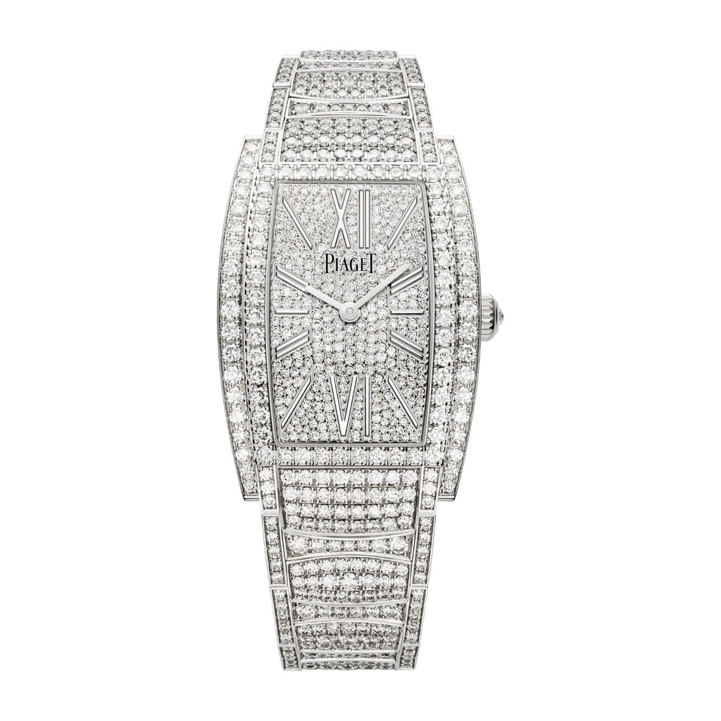 Limelight Tonneau High Jewelry watch, 27 x 38 mm. Case in rhodium finish 18K white gold set with 86 brilliant-cut diamonds (approx. 1.8 ct). Dial set with 292 brilliant-cut diamonds (approx. 0.8 ct) with hour markers in rhodium finish 18K white gold. Crown set with a rose-cut diamond (approx. 0.1 ct). Rhodium finish 18K white gold bracelet set with 600 brilliant-cut diamonds (approx. 6.9 ct). Piaget 690P quartz movement.