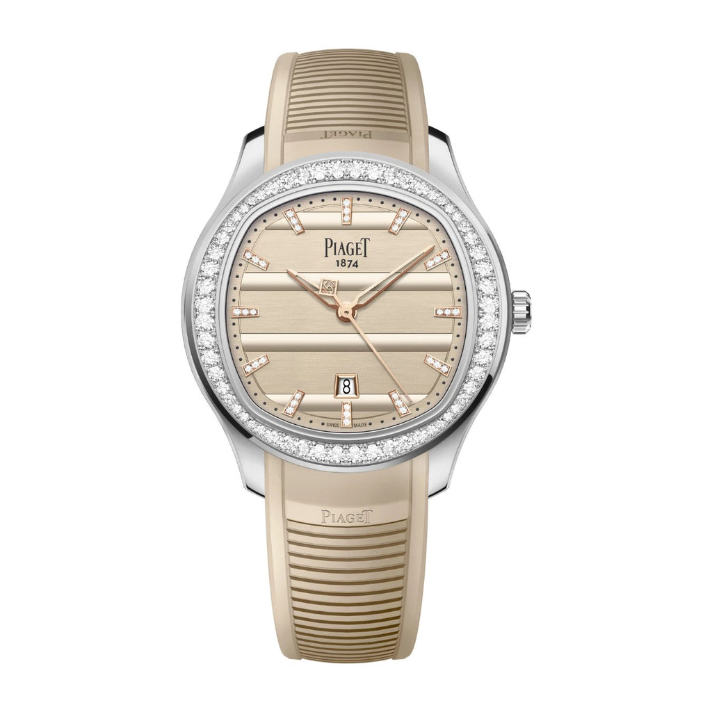 Piaget Polo Date watch, 36 mm. 150th anniversary watch. Steel case set with 60 brillant-cut diamonds (approx. 0.97ct). Dial with hour-markers set with 36 brilliant-cut diamonds (approx. 0.08 ct). Sapphire crystal case back. Interchangeable rubber bracelet. Manufacture 500P1 automatic mechanical movement. Limited edition of 300.