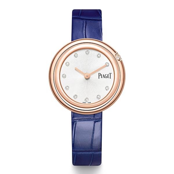 omen’s watch in rose gold and diamonds. Silvered gem-set dial. Rotating bezel. Interchangeable lapis blue alligator-skin strap. A constantly transforming fashion icon, this rose gold and diamond watch takes inspiration from Possession's emblematic turning rings. A halfmoon-set diamond adorns the rotating bezel as it turns mischievously around the silvered dial with gem-set hour markers. The lapis blue alligator-skin strap with a rose gold plated stainless steel ardillon buckle brings out the sensually curved 34 mm rose gold case and features an easy interchangeable system and a second strap so that the wearer can change its style to suit her mood.