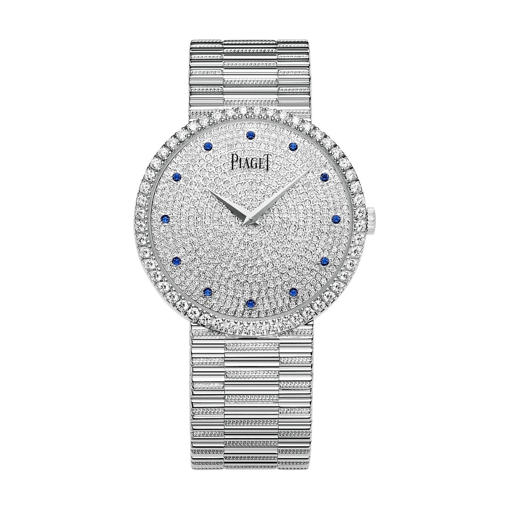 A traditional watch with pure, retro-chic lines, this ultra-thin watch features a characteristic and particularly flexible bracelet that's exceptionally crafted. Piaget has revisited one of its historical techniques to create this instantly recognizable model with its twisted threads that are subtly welded to the links. This traditional white-gold watch, set with diamonds and sapphires, features the ultra-thin 430P mechanical movement just 2 mm thick to give timeless elegance and thin lines.