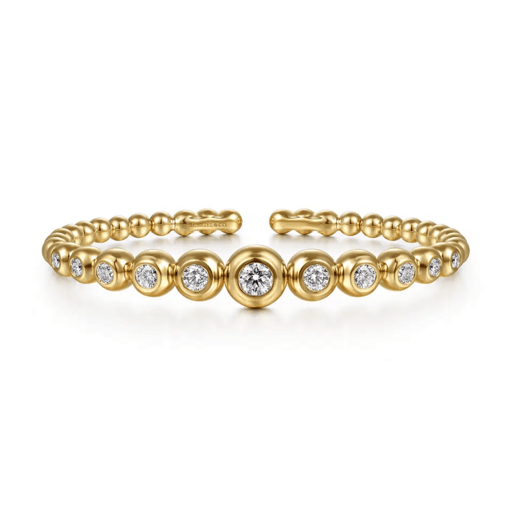 Gabriel & Co. Bujukan and Graduating Diamond Split Bangle Bracelet in 14 karat yellow gold. Diamonds totaling 1.5 carat.