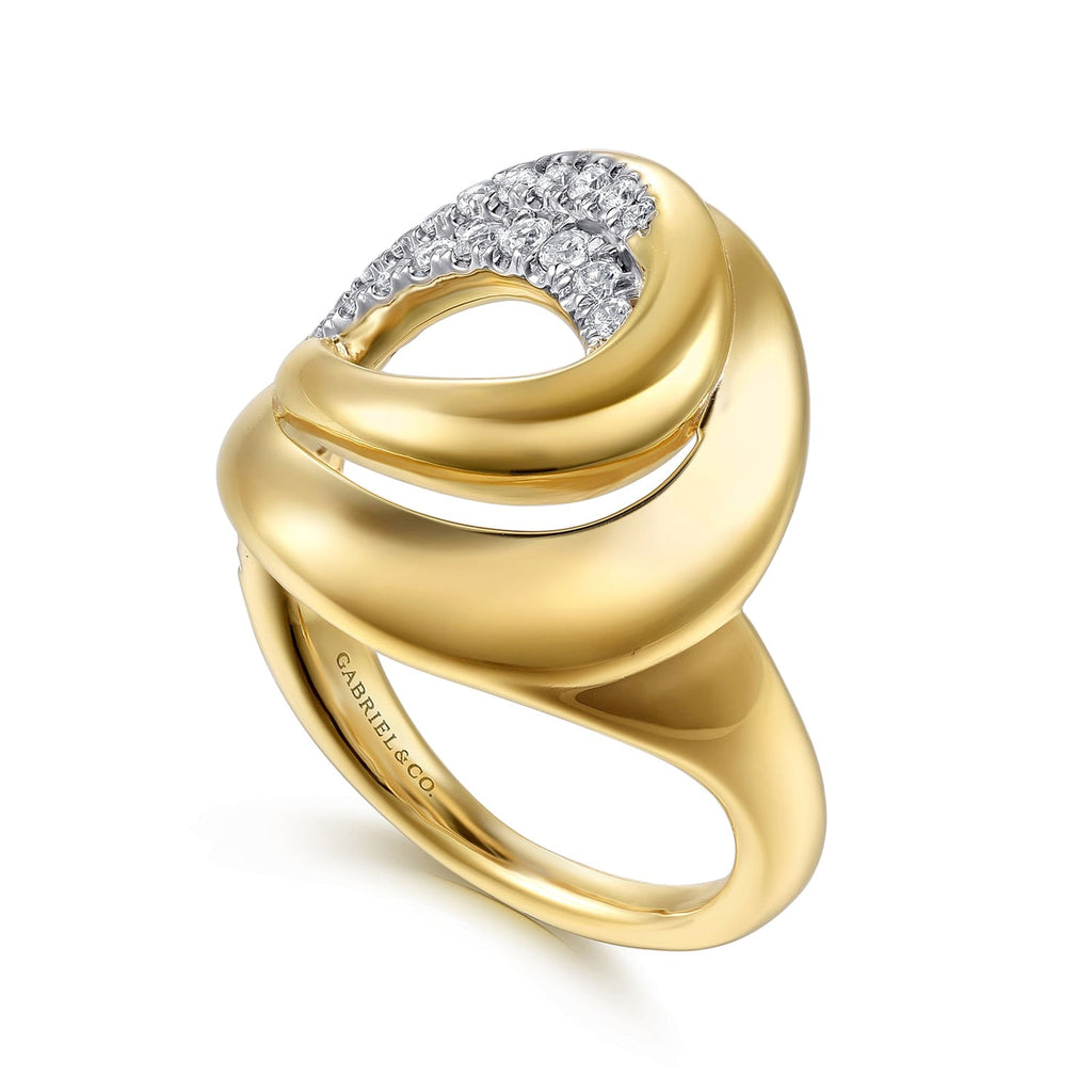 This Gabriel & Co. Diamond Swirl Ring in 14K yellow gold with D5 diamonds.