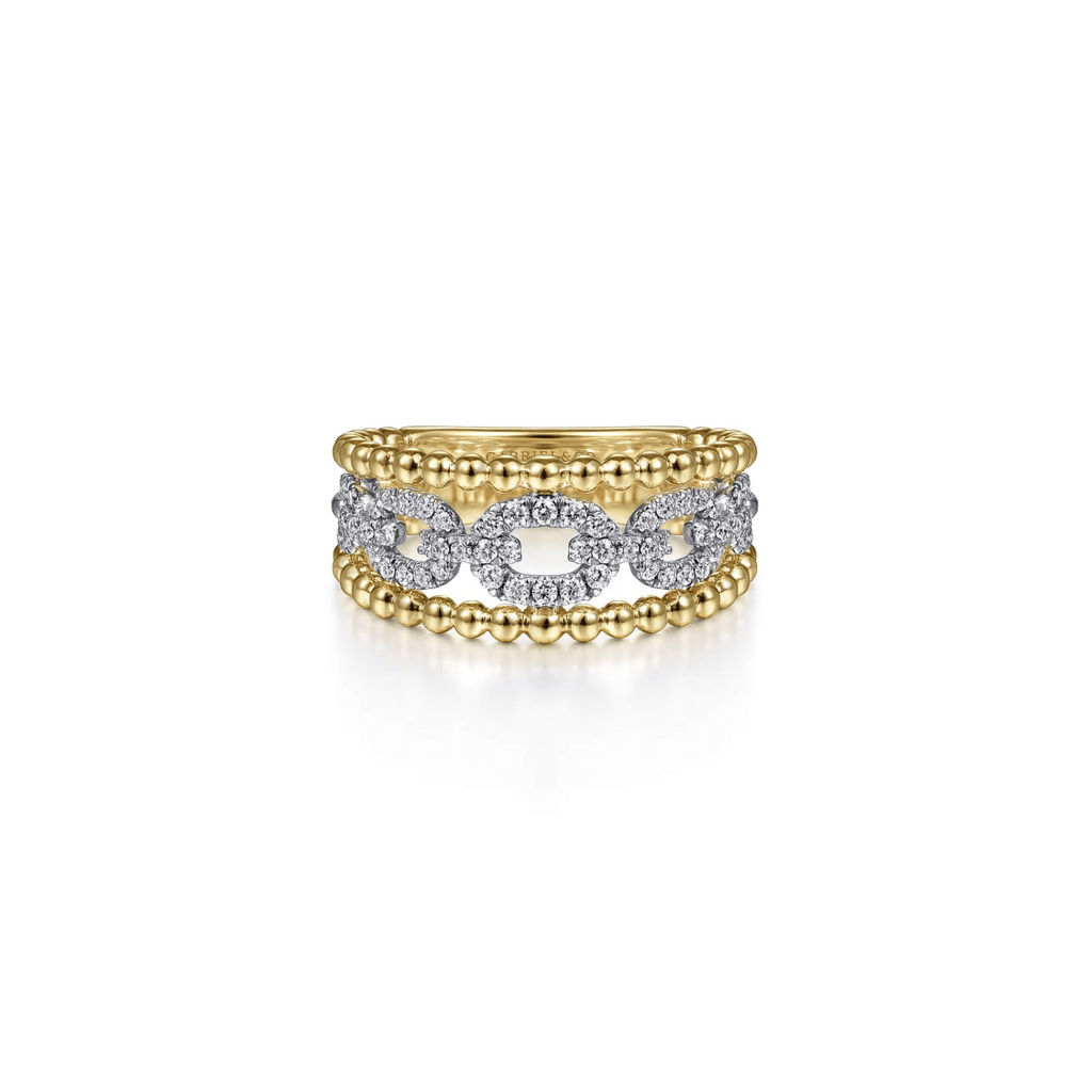 This exquisite ring features 14K white and yellow gold with pave diamond links and Bujukan bead accents, showcasing a total diamond weight of 0.35 carats.