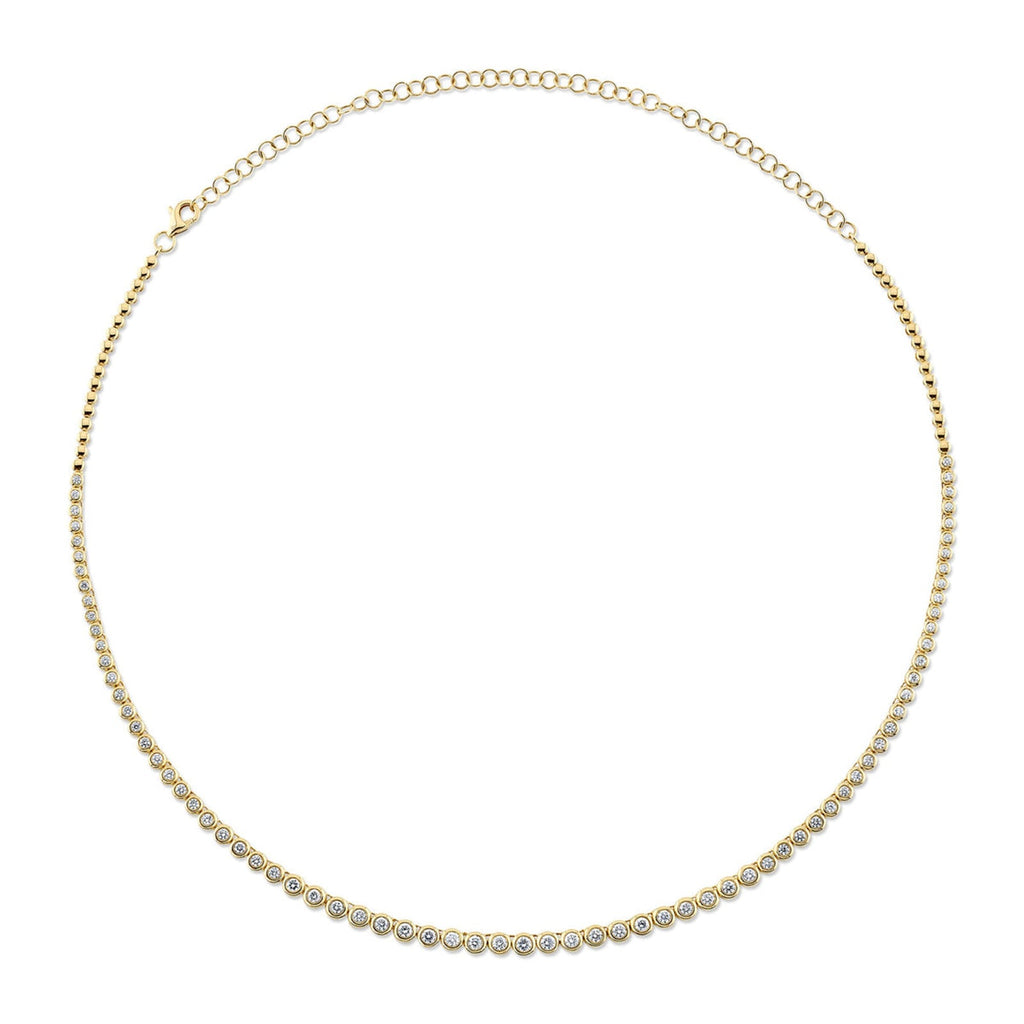 Shy Creation Diamond Bezel Tennis Necklace in 14 karat yellow gold with diamonds totaling 2.00 carats with adjustable chain.