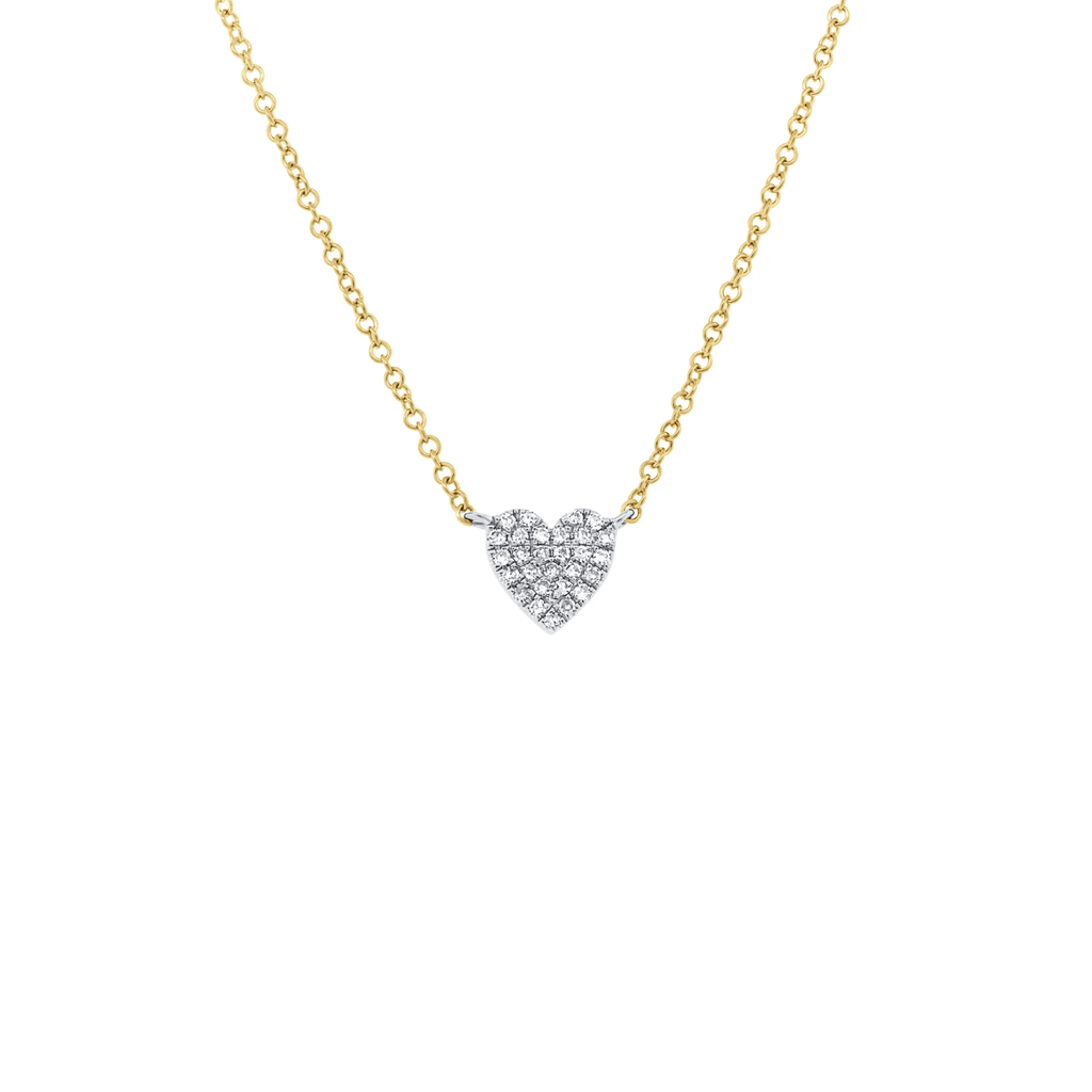 Diamond pave heart necklace in 14 karat yellow gold. Diamonds totaling 0.09 carat weight. The length of the necklace measures 18 inches.