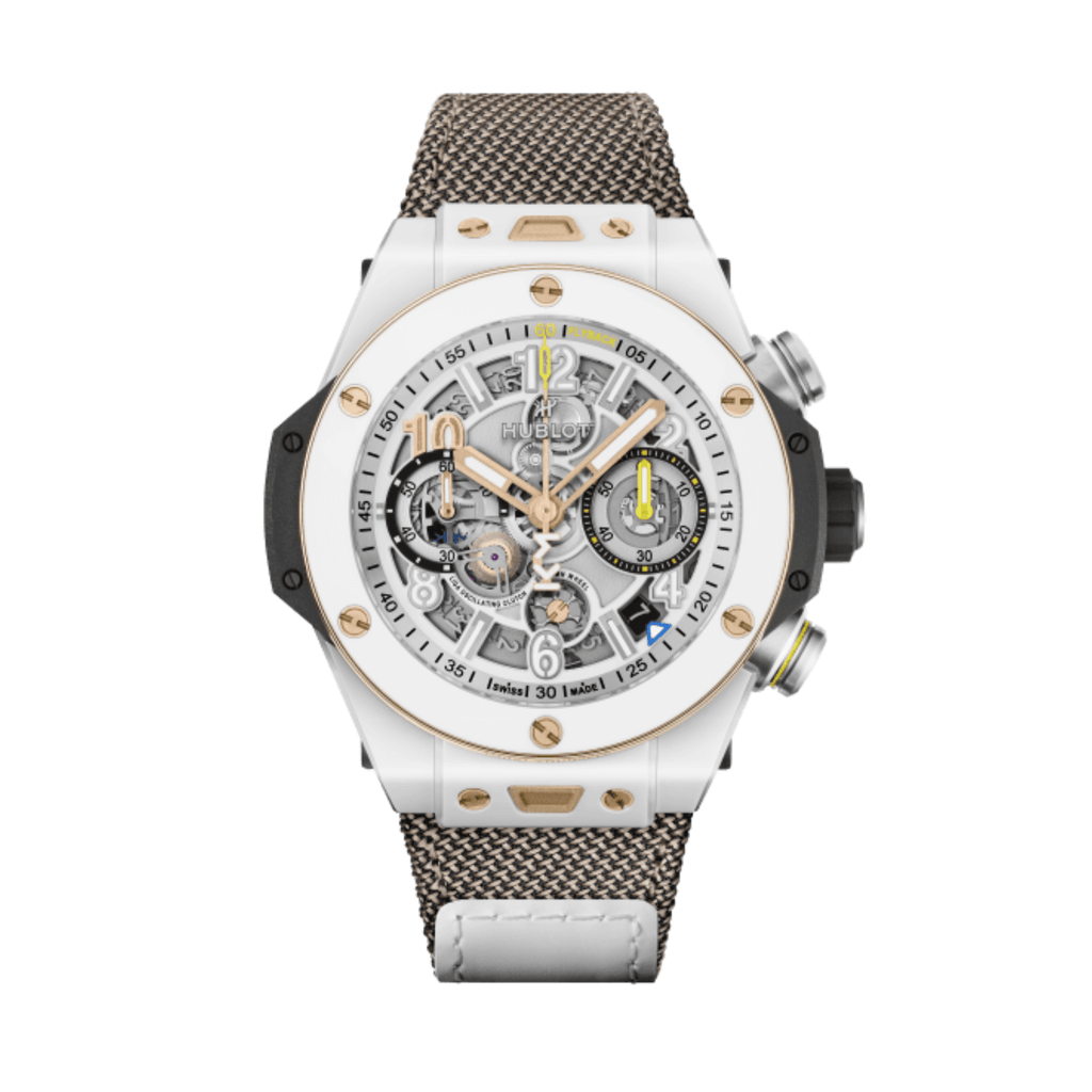 This watch features a 44 mm case crafted from white ceramic with a combination of polished and microblasted finishes, paired with a polished 18K King Gold bezel engraved with “Trust Yourself” and accented by a microblasted white ceramic upper ring. It offers water resistance up to 100 meters (10 ATM) and is fitted with a sapphire crystal treated with an anti-reflective coating for enhanced clarity. The skeleton dial combines matte grey plating with white elements, showcasing the HUB1280 UNICO in-house self-winding chronograph movement with a flyback function and column wheel, delivering an approximate 72-hour power reserve. The watch is paired with a King Gold–colored fabric strap featuring a Velcro fastener, along with an additional black and white structured lined rubber strap, and is secured with a white ceramic sport buckle.