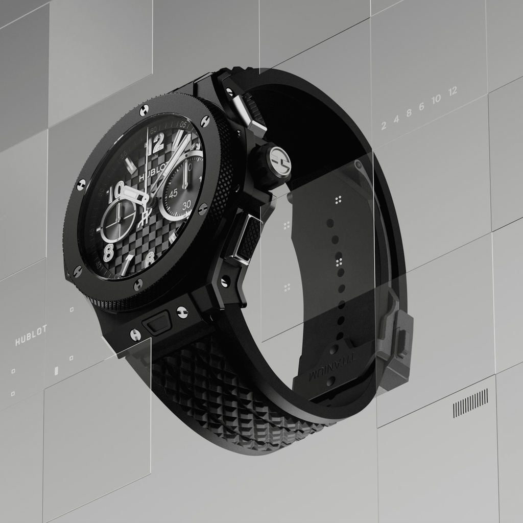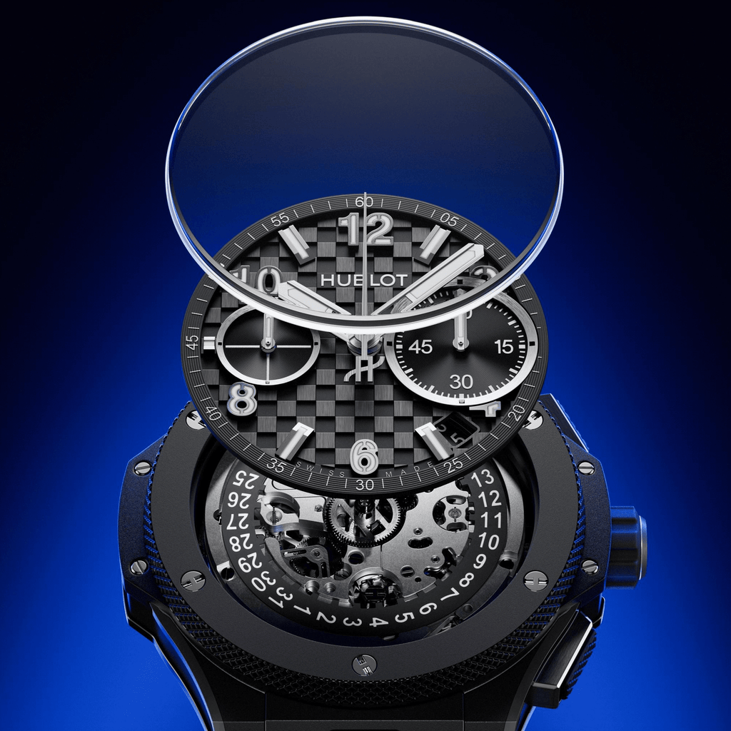 43 mm microblasted and polished black ceramic case with a matching structured black ceramic bezel, sapphire crystal with anti-reflective treatment, carbon-effect dial, 100 m water resistance, and HUB1280 UNICO manufacture self-winding flyback chronograph movement offering approximately 72 hours of power reserve, paired with black structured rubber straps and a black ceramic and black-plated titanium deployant buckle clasp.