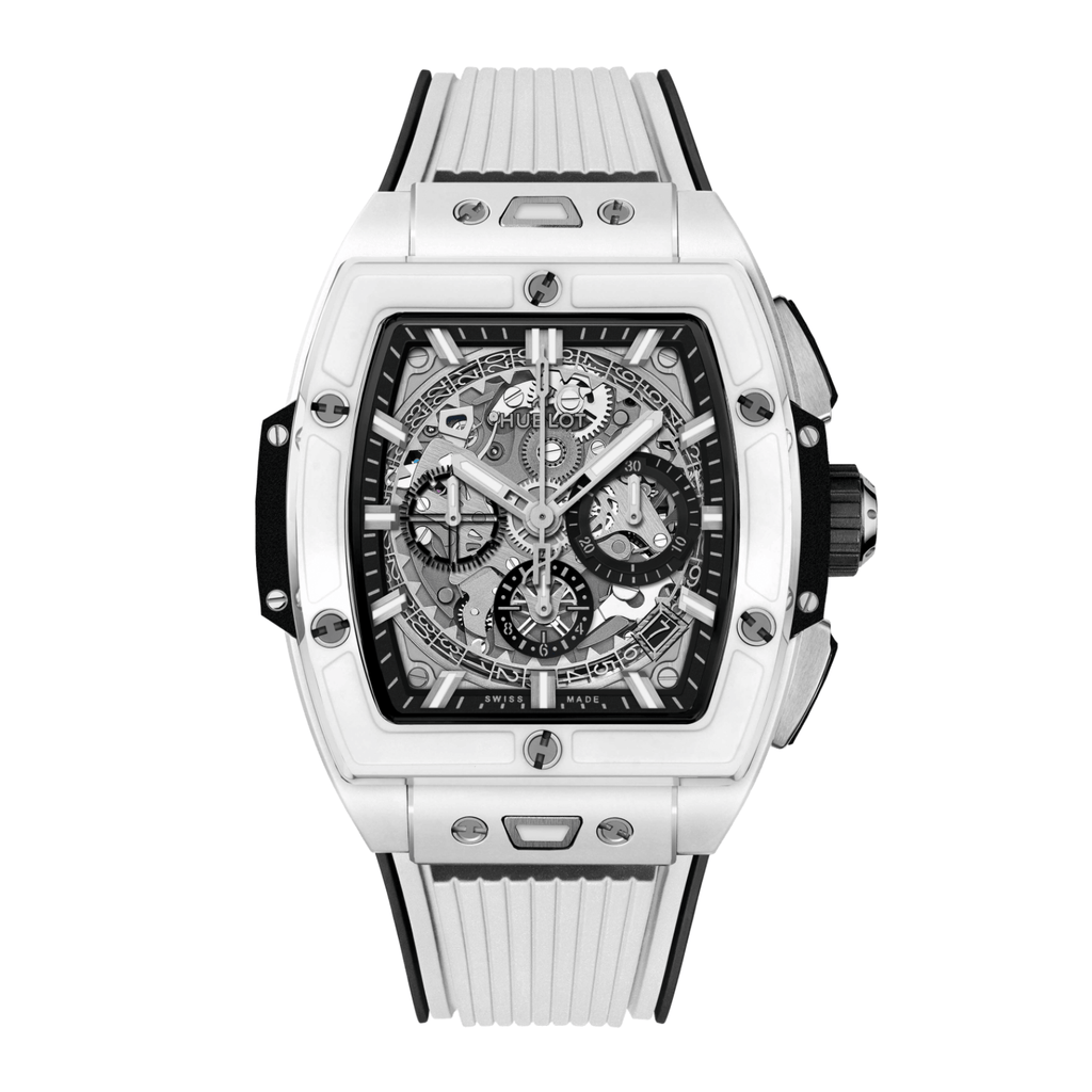 The Hublot Spirit Of Big Bang White Ceramic 42mm features a 42mm case size that has been Microblasted and Polished. The bezel is also Microblasted and Polished, and made of white ceramic with 6 H-shaped titanium screws. It has a water resistance of 100m or 10 ATM. The crystal is made of Sapphire with Anti-reflective Treatment and the dial is Sapphire Crystal. The movement is powered by the HUB4700 Self-winding Skeleton Chronograph Movement and has a power reserve of 50 Hours. Black and white lined structured rubber strap.