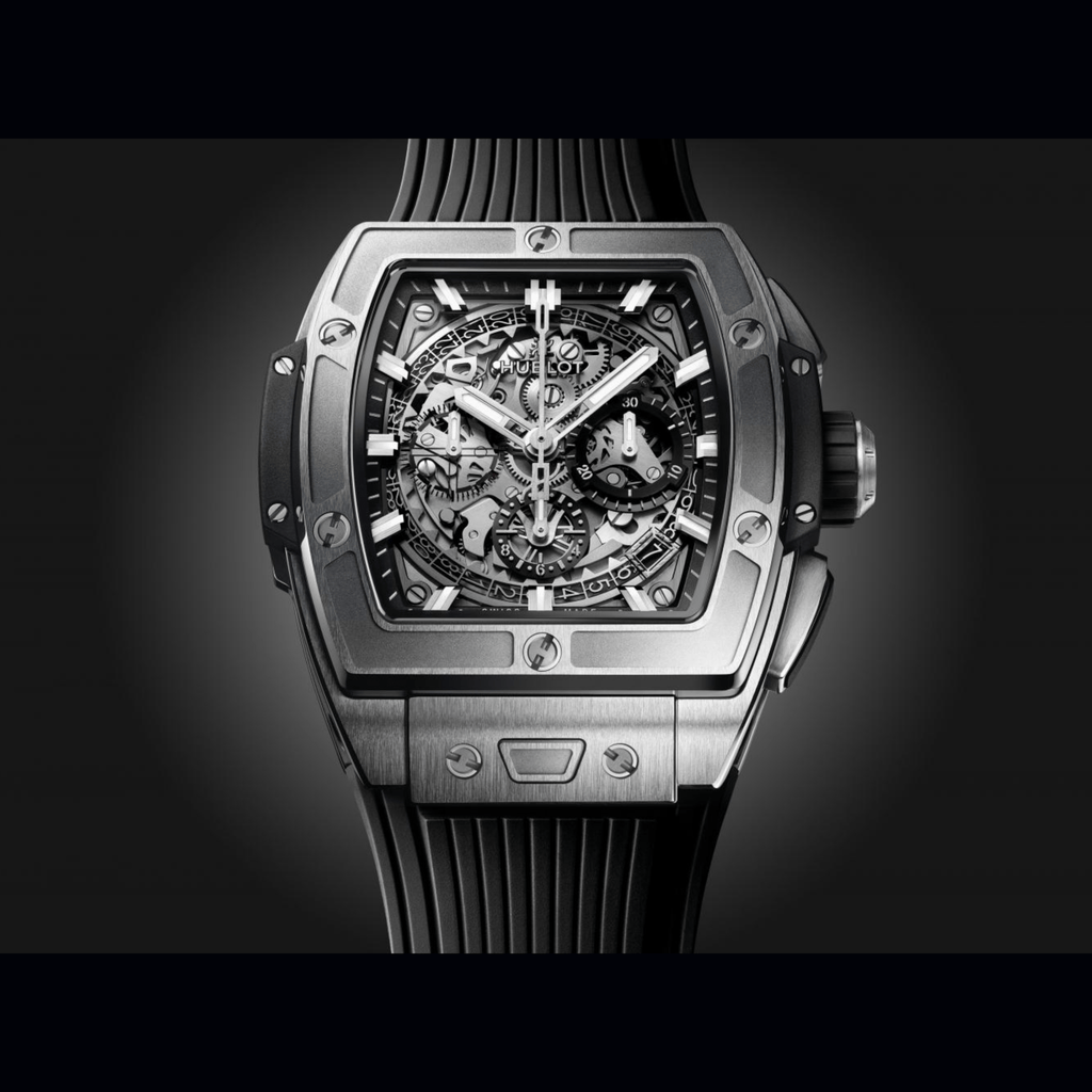 Hublot Spirit of Big Bang Titanium in a 42mm titanium case, sapphire dial. Water resistance of 100m. HUB4700 Self-winding Skeleton Chronograph Movement, power reserve of 50 hours. Rubber strap