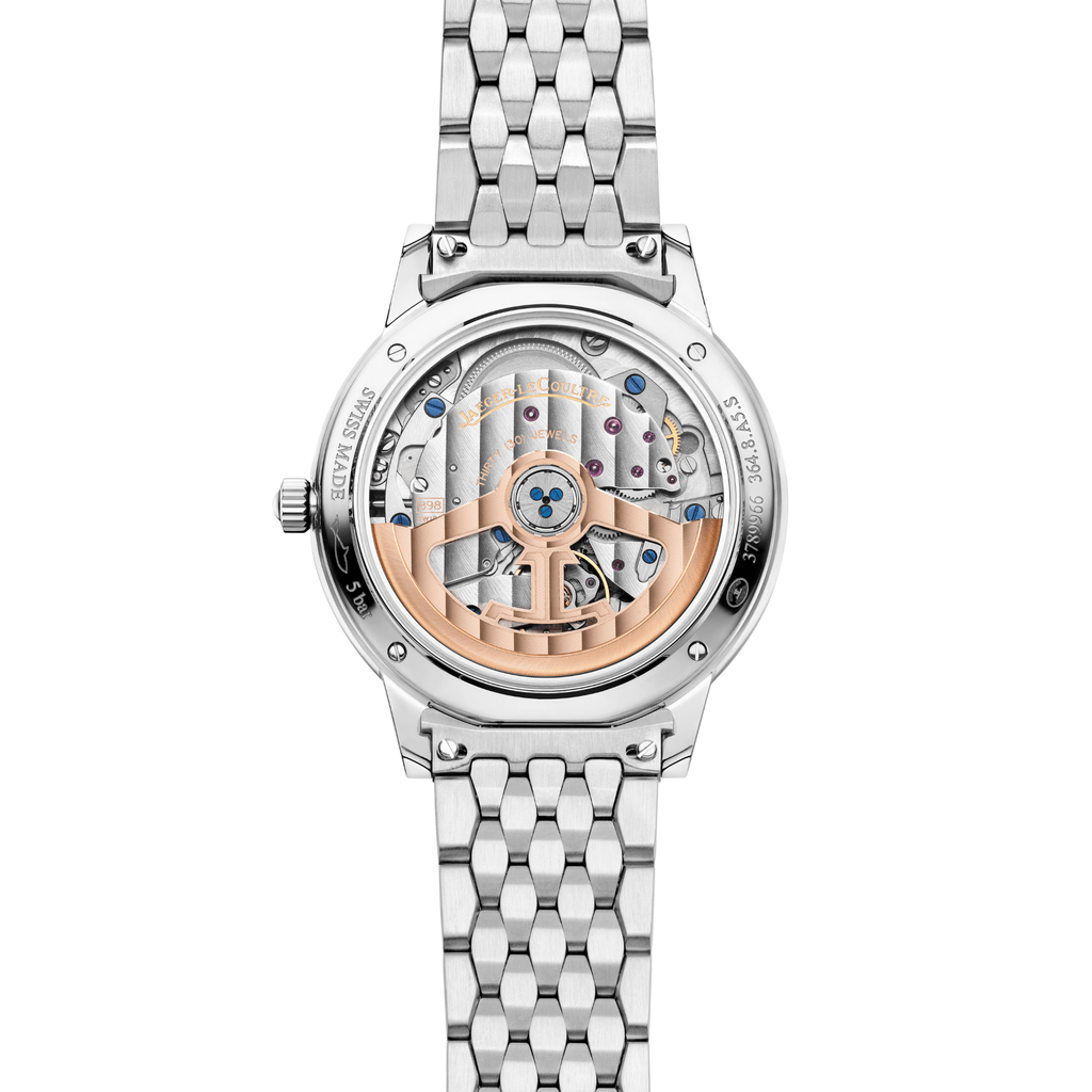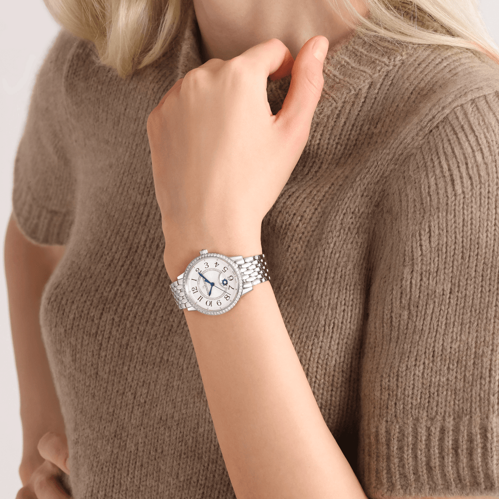 The Jaeger-LeCoultre Rendez-Vous Classic Night & Day combines refined elegance with sophisticated functionality. This 34 mm timepiece features a stainless steel case adorned with a diamond-set bezel and a silvered grey Guilloché dial that captures light beautifully. The automatic movement powers an innovative day/night indicator while maintaining an impressive 70-hour power reserve. Water-resistant to 5 bar, it's equipped with a matching stainless steel bracelet, making it equally suited for daily wear and special occasions.