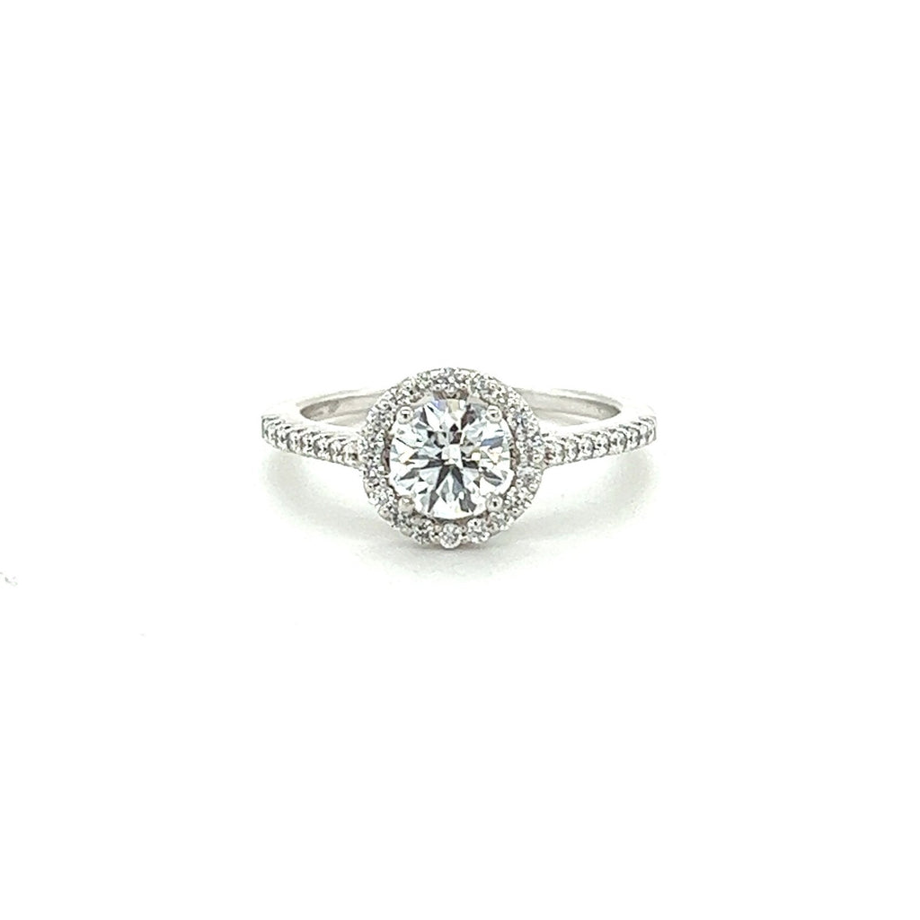 Memoire Platinum round-cut halo diamond engagement ring.