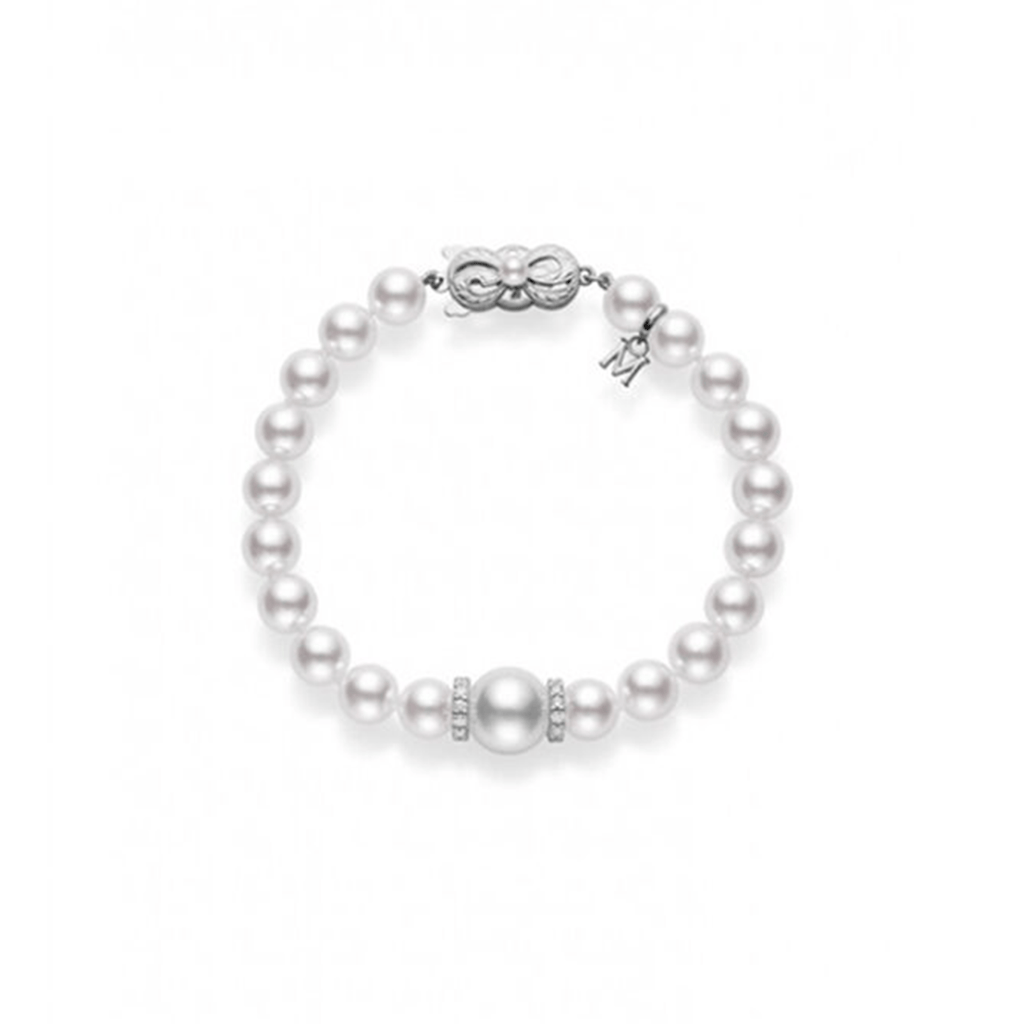 Mikimoto Fusion Akoya & White South Sea Cultured Pearl Bracelet in 18 karat white gold with diamonds totaling 0.30 carats.