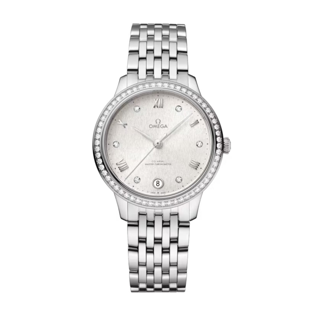 This 34 mm stainless steel model features a diamond-paved bezel and a silvery dial with a stamped random vertical pattern in a sun-brushed finish. The display is distinguished by rhodium-plated hands, as well as alternating Roman numerals and diamond markers.