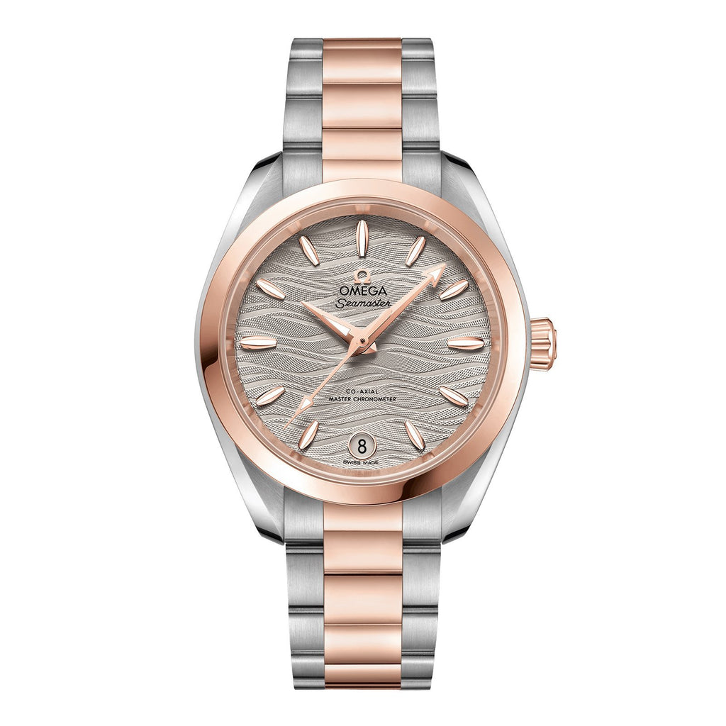 In this model, the symmetrical 34 mm case and integrated bracelet are crafted from stainless steel and 18K Sedna™ gold. The waved agate grey dial features a date window at 6 o’clock, while 18K Sedna™ gold is used for the hands as well as the indexes, which are shaped like sailboat hulls.