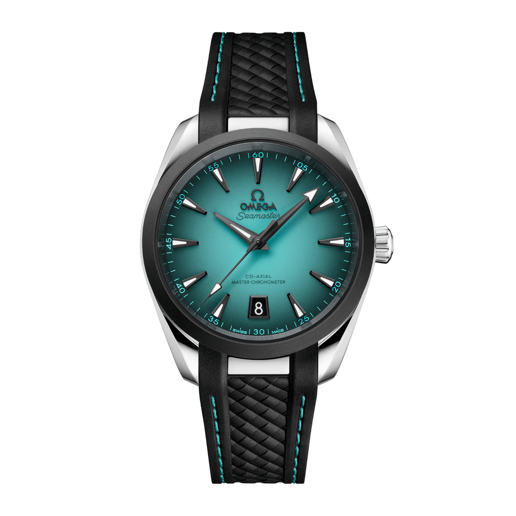 This 38 mm model has a symmetrical case in stainless steel and a bezel formed of brushed black ceramic. The lacquered turquoise dial offers a mesmerizing colour inspired by the ocean, and is accentuated with a black gradient effect, along with facetted hands and hour markers with a grey PVD treatment and white Super-Luminova. The OMEGA logo and date window are also grey PVD treated, matching the grey transferred wording, while the outer minute track is presented in turquoise. Comfort around the wrist is assured through the integrated black rubber strap, which includes turquoise stitching and a foldover clasp. On the inside, this watch is powered by OMEGA’s Co-Axial Master Chronometer Calibre 8800, certified at the industry’s highest standard by the Swiss Federal Institute of Metrology (METAS).