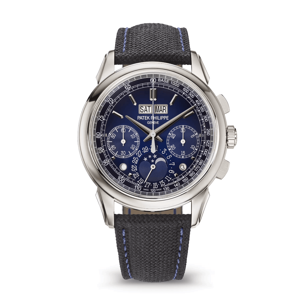 Patek Philippe revisits its split-seconds chronograph with perpetual calendar by treating it to a white gold case and a sunburst navy blue dial. The navy-blue composite strap with a fabric pattern and contrasting red stitching brings an undeniably sporty look...