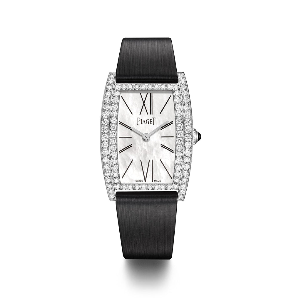 The feminine tuxedo style of the Limelight tonneau-shaped watch, which unfurls its elegant treasures on every occasion with its two rows of 86 diamonds set either side of the white gold case. On its white mother-of-pearl dial, slender black Roman numerals and hour markers measure the passing hours to the rhythm of the 438P caliber, an ultra-thin hand-wound mechanical movement that is only 2.1 mm thick. Piaget has embellished this exclusive mechanism with traditional finishes, visible through the sapphire crystal case back: circular Côtes de Genève, circular-grained bottom plate and bridges, beveled bridges and blued screws.