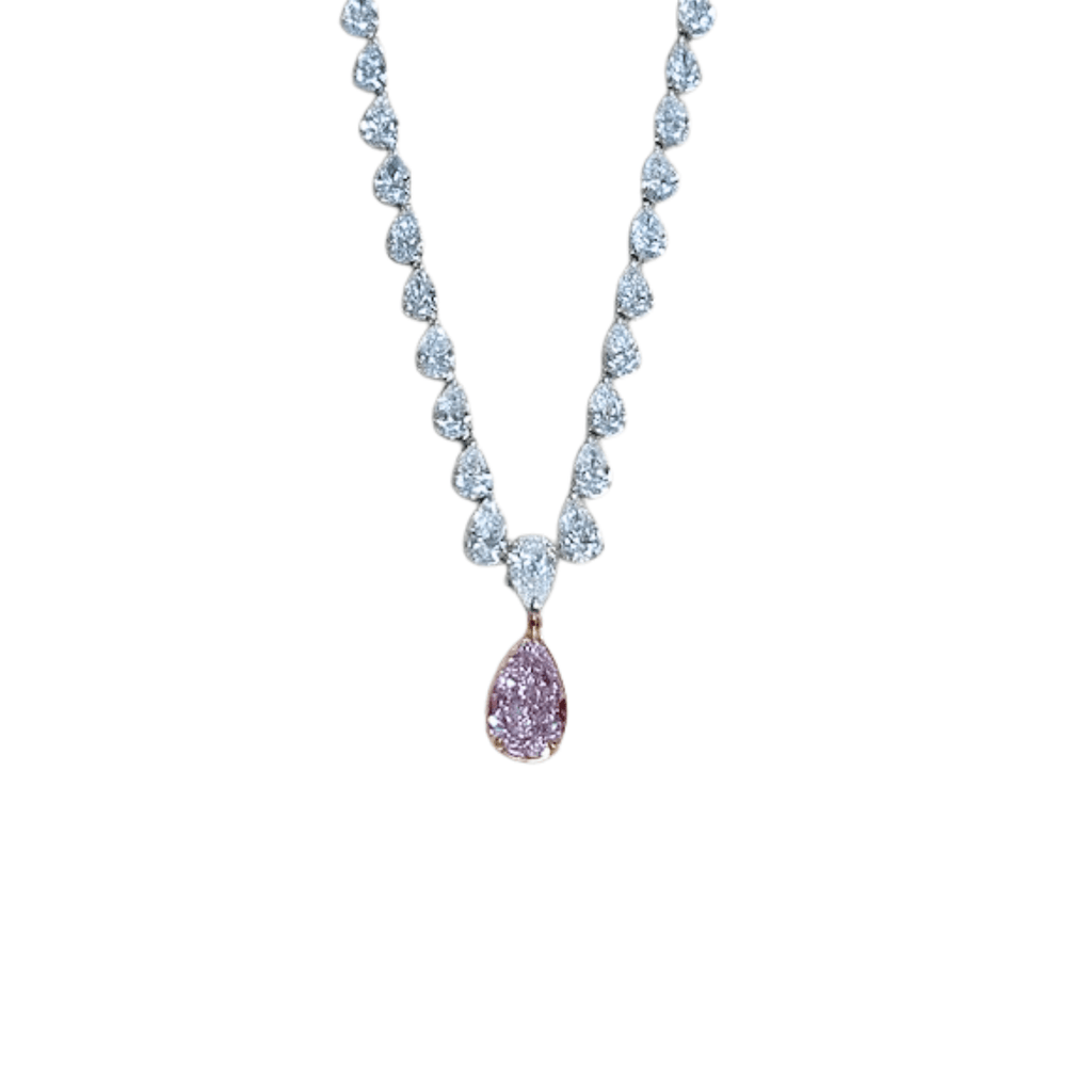 The pendant features a pear-shaped pink diamond weighing 2.47 carats with VS1 clarity. It is surrounded by additional diamonds with a total weight of 17.28 carats. The necklace is crafted in 18 karat white and rose gold.