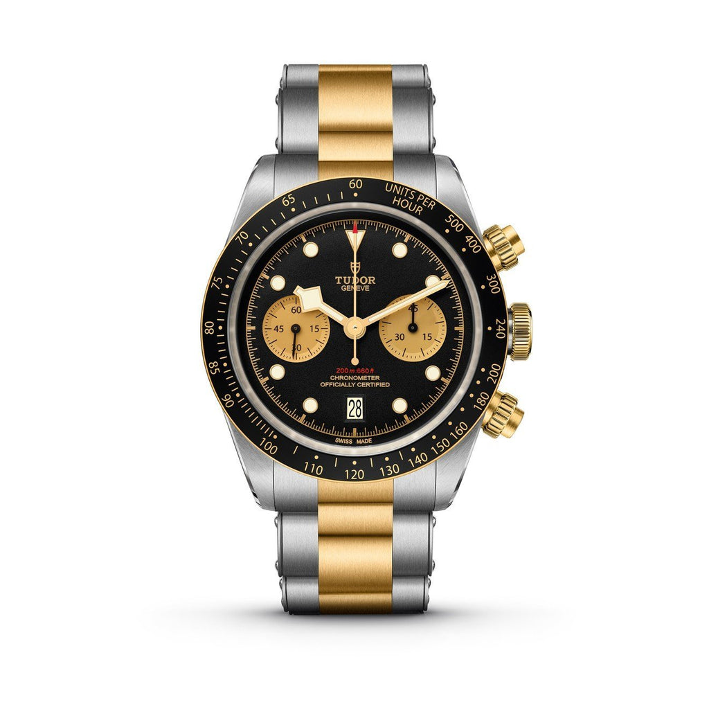 41-mm steel case, steel and gold bracelet. 41-mm steel case with polished and satin finish. Fixed yellow gold bezel with matte black anodized aluminum disk with tachymetric scale, yellow gold markings. Manufacture Caliber MT5813 (COSC) Self-winding mechanical movement with bidirectional rotor system. Black, domed. Yellow gold screw-down winding crown with the TUDOR rose Yellow gold screw-down pushers at 2 and 4 o'clock. Domed sapphire crystal. Waterproof to 200 m (660 ft). Riveted steel and gold bracelet, polished and satin finish, with folding clasp and safety catch.Yellow gold screw-down winding crown with the TUDOR rose in relief Yellow gold screw-down pushers at 2 and 4 o'clock