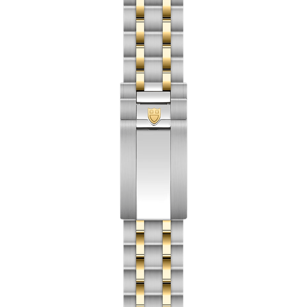 The TUDOR Royal 36mm combines stainless steel and yellow gold in a sophisticated timepiece built for refined elegance. Its 36mm case features polished and satin finishes with a 9mm lug width and 9.7mm thickness, striking the perfect balance between presence and wearability. Powered by the Manufacture Calibre MT5412 movement—COSC-certified and tuned to -2/+4 seconds—this self-winding mechanical watch delivers approximately 70 hours of power reserve. The screw-down winding crown, topped with a 0.1mm yellow gold cap bearing the TUDOR logo, ensures secure operation. A fixed solid yellow gold bezel frames the champagne-colored dial, adorned with applied Roman numerals and a date window at 3 o'clock. Protected by a sapphire crystal and waterproof to 100m, the watch sits on a 5-link integrated bracelet in stainless steel with gold-capped center links, secured by a "T-fit" folding clasp with safety catch and solid yellow gold logo.
