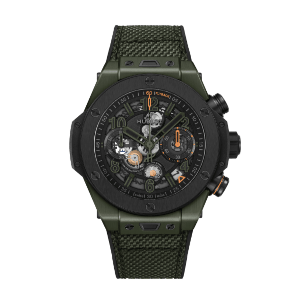 This watch features a 44 mm case made from dark green ceramic with a combination of satin-brushed and polished finishes, complemented by a polished black-plated titanium bezel with a satin-finished black ceramic upper ring. It is water-resistant up to 100 meters (10 ATM) and fitted with a sapphire crystal enhanced by an anti-reflective coating for optimal clarity. The black-plated skeleton dial blends satin and matte textures, revealing the HUB1280 UNICO in-house self-winding chronograph movement with a flyback function and column wheel, offering an approximate 72-hour power reserve. The timepiece is paired with a black rubber and dark green fabric strap featuring distinctive “H” stitching, along with an additional black structured lined rubber strap, and is secured by a black ceramic and black-plated titanium deployant buckle clasp.
