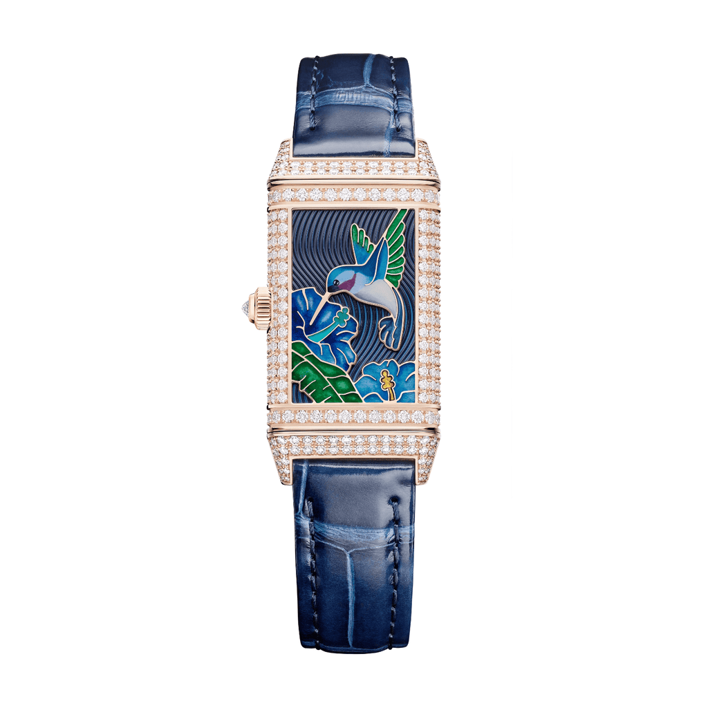 La Vallée des Merveilles™ celebrating Hawaii's nature with the Reverso One ‘Hibiscus Rosa’. The timepiece celebrates Jaeger-LeCoultre’s Métiers Rares™, combining watchmaking with High Jewellery. Its mother-of-pearl dial features subtly transferred floral indexes, all enclosed by Art Deco brackets. The case is embellished with a total of 645 diamonds. Upon reversing the timepiece, one discovers the art of Grand Feu champlevé enamel. This enamel creation is enriched by 24K gold leaf (999/1000) paillonnage and snow-set diamonds, through the use of 9 varied diamond sizes. This timepiece is further accentuated by a full-set bracelet with 384 diamonds. The 1029 diamonds on the piece total ~8.0 carats and requires 160 hours of gem-setting.