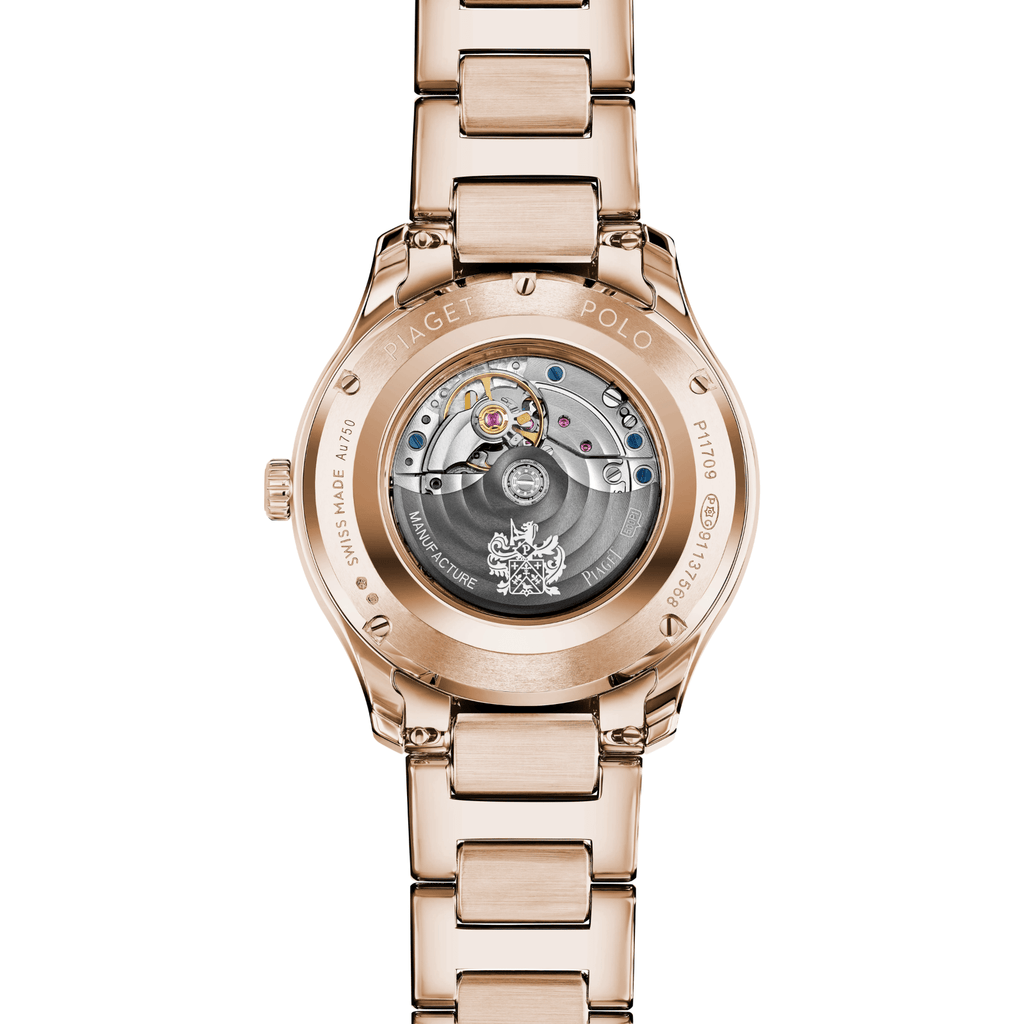 Piaget Polo Signature Date watch, 36 mm. Case in 18K rose gold set with 60 brilliant-cut diamonds (approx. 0.97ct). Dial with hour-markers in 18K rose gold set with 36 brilliant-cut diamonds (approx. 0.07 ct). Interchangeable bracelet in 18K rose gold. Watch delivered with a secondary dark blue rubber strap and 18K rose gold pin buckle. Sapphire crystal case back. Manufacture 500P1 automatic mechanical movement.