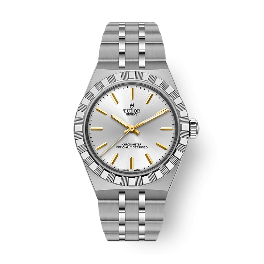 The TUDOR Royal 30mm combines refined elegance with robust engineering. Its stainless steel case features a polished and satin finish, housing a precise Manufacture Calibre MT5201 movement certified by COSC. The self-winding mechanism delivers approximately 50 hours of power reserve, while the screw-down crown ensures reliable waterproofing to 100 meters. A sapphire crystal protects the silver dial with applied stick markers, and the integrated 5-link bracelet balances brushed and polished surfaces for sophisticated contrast. At just 8.7mm thick with 7mm lugs, this timepiece offers versatile wearability for any occasion.