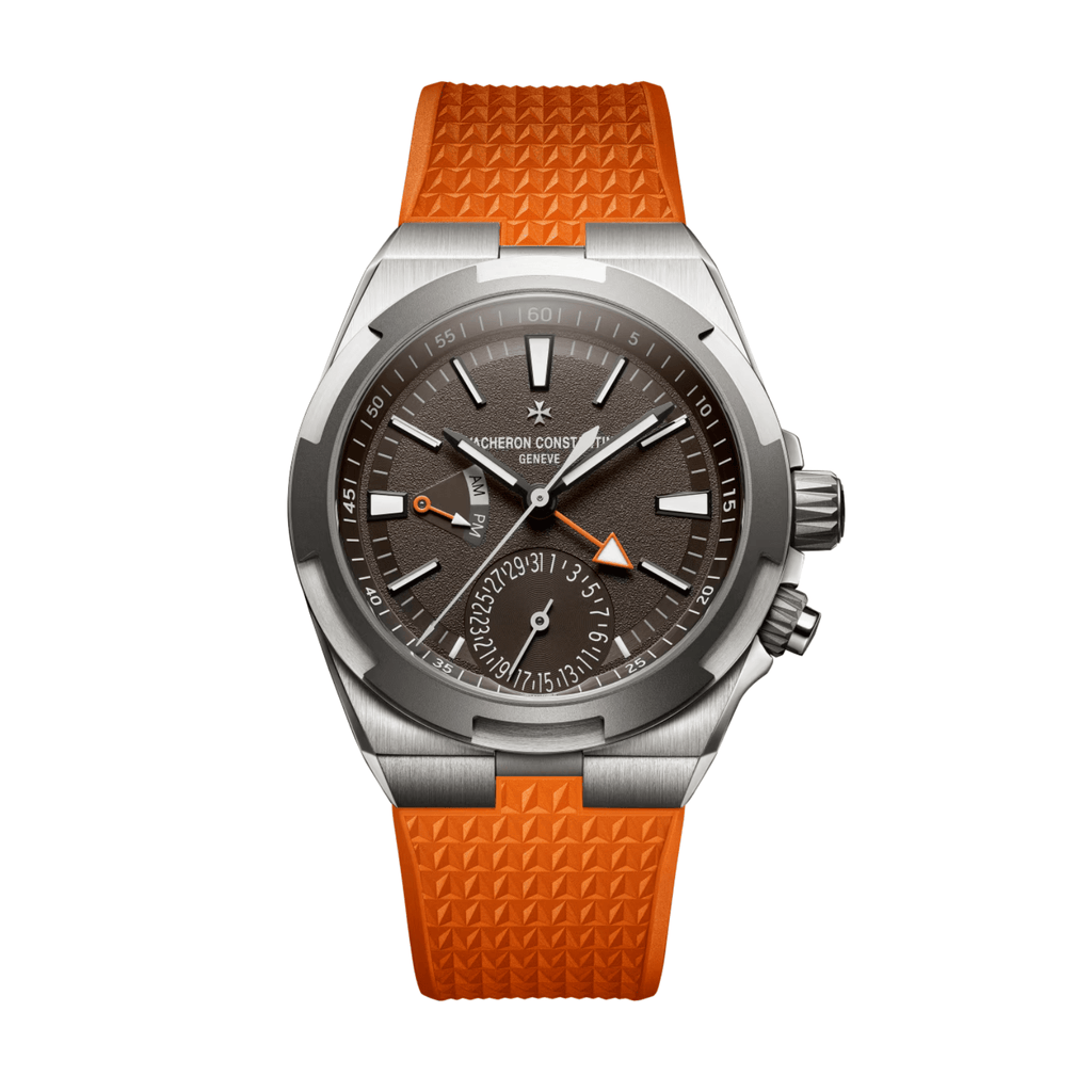 A direct descendant of the piece that was created for photographer and explorer Cory Richards, and thoroughly field-tested under extreme conditions during his 2019 ascent of Everest, the Overseas dual time Cardinal Points comes in different shades. The 41mm case, integrated bracelet and interchangeable folding clasp are all made of titanium, chosen for its lightness and strength. The distinctive aesthetic and high-performance qualities of titanium are heightened by a matte anthracite grey finish on the bezel, crown and pusher ring. It creates a subtle contrast that highlights the cutaway notches which echoes the shape of the Maltese Cross on the Overseas distinctive bezel. A closer look at the dial invites the slow discovery of its details, with a mix finishes bringing depth and sophistication. The orange hands that indicate the second time zone and the AM/PM function bring a dash of contrast to dial, underlining the watch’s sporty character. The watch is customizable thanks to its three easily interchangeable straps – two rubber and one titanium.