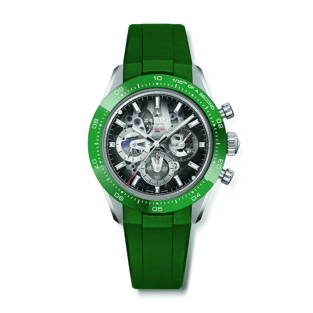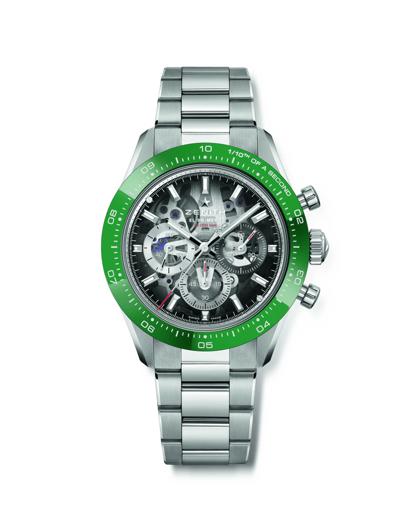 The watch features a transparent sapphire dial with a smoked black gradient, revealing the skeletonized movement, and includes a stop-second mechanism along with a folding clasp with micro-adjustment. Powered by the Primero column-wheel chronograph, it can measure and display 1/10th of a second, with a silicon escape wheel and lever and a 1/10th of a second indication on the ceramic bezel. The automatic movement offers a 60-hour power reserve, housed in a 41mm stainless steel case with a green ceramic bezel and 10 ATM water resistance, complemented by a stainless steel bracelet. It displays hours and minutes at the center, small seconds at 9 o’clock, and the 1/10th of a second chronograph function.