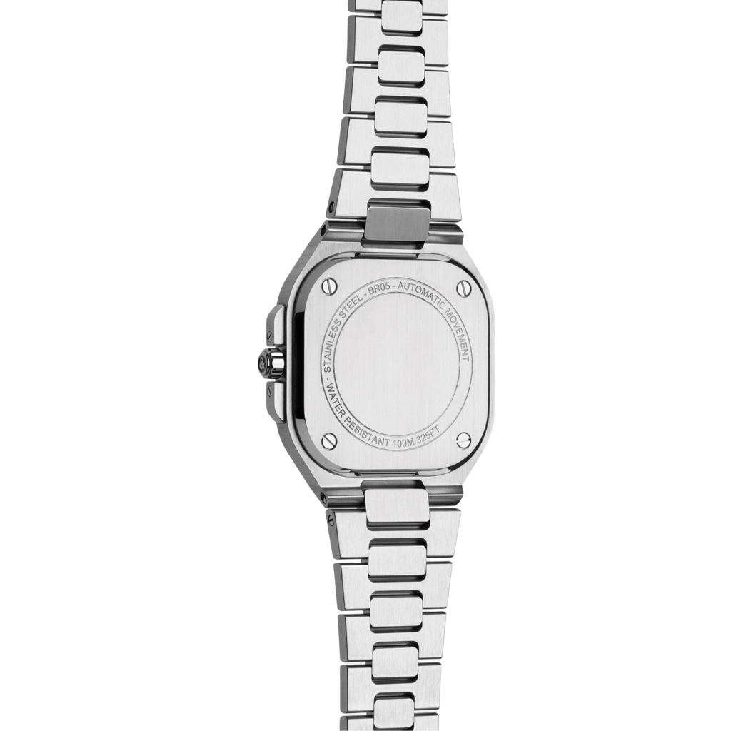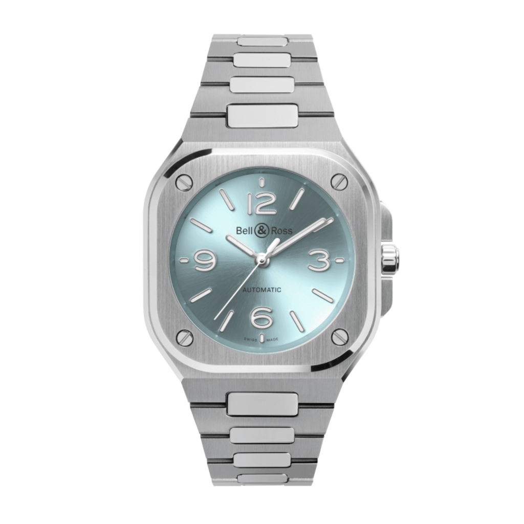The BR-05 36mm Ice Blue Steel watch features the BR-CAL.329 automatic mechanical movement with a 54-hour power reserve. Its 36mm satin-polished steel case is 8.5 mm thick and has a screw-down crown and crown guard. The sunray ice blue dial has "Baignoire-style" applique numerals and indices filled with white Super-LumiNova® X1 (green emission), along with skeletonized hour and minute hands filled with the same material. The sapphire crystal is coated with an anti-reflective finish, and the watch is water-resistant up to 100 meters. The satin-polished steel strap is paired with a folding buckle, also in satin and polished steel.