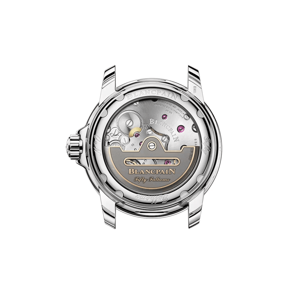 The Blancpain Fifty Fathoms Automatique features a robust steel case measuring 42.3mm in diameter and 14.3mm in thickness, designed to withstand water pressure up to 30 bar. Its sapphire case back offers durability and a clear view of the movement. The watch is equipped with a steel bracelet, combining strength and comfort for everyday wear. This timepiece balances technical precision with refined craftsmanship, ideal for professionals seeking reliability and elegance in a diving watch.