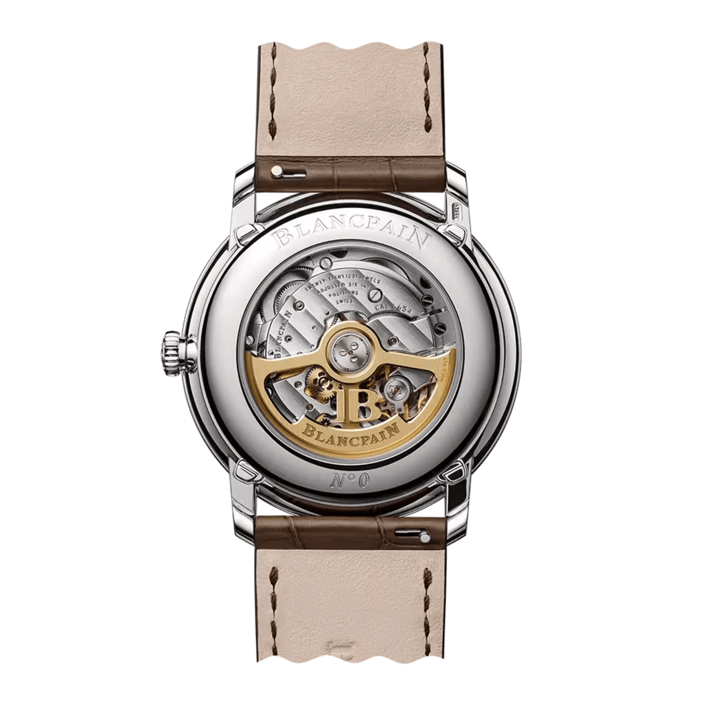 This timepiece features a 40mm stainless steel case paired with a brown dial. It is powered by an automatic movement with a 72-hour power reserve. Functions include moon phase and date display, complemented by an alligator leather strap.