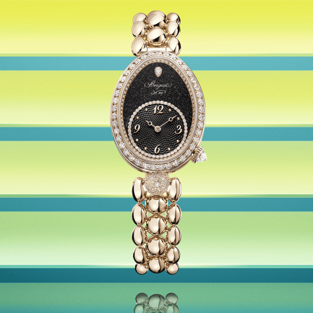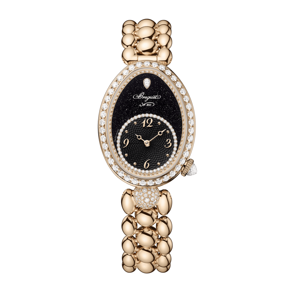This timepiece features a 25mm case crafted from 18K Breguet gold with a delicate black dial. It offers water resistance up to 3 bar and is paired with. Equipped with small seconds and moon phase complications, it houses an automatic movement with a 38-hour power reserve. Breguet gold bracelet