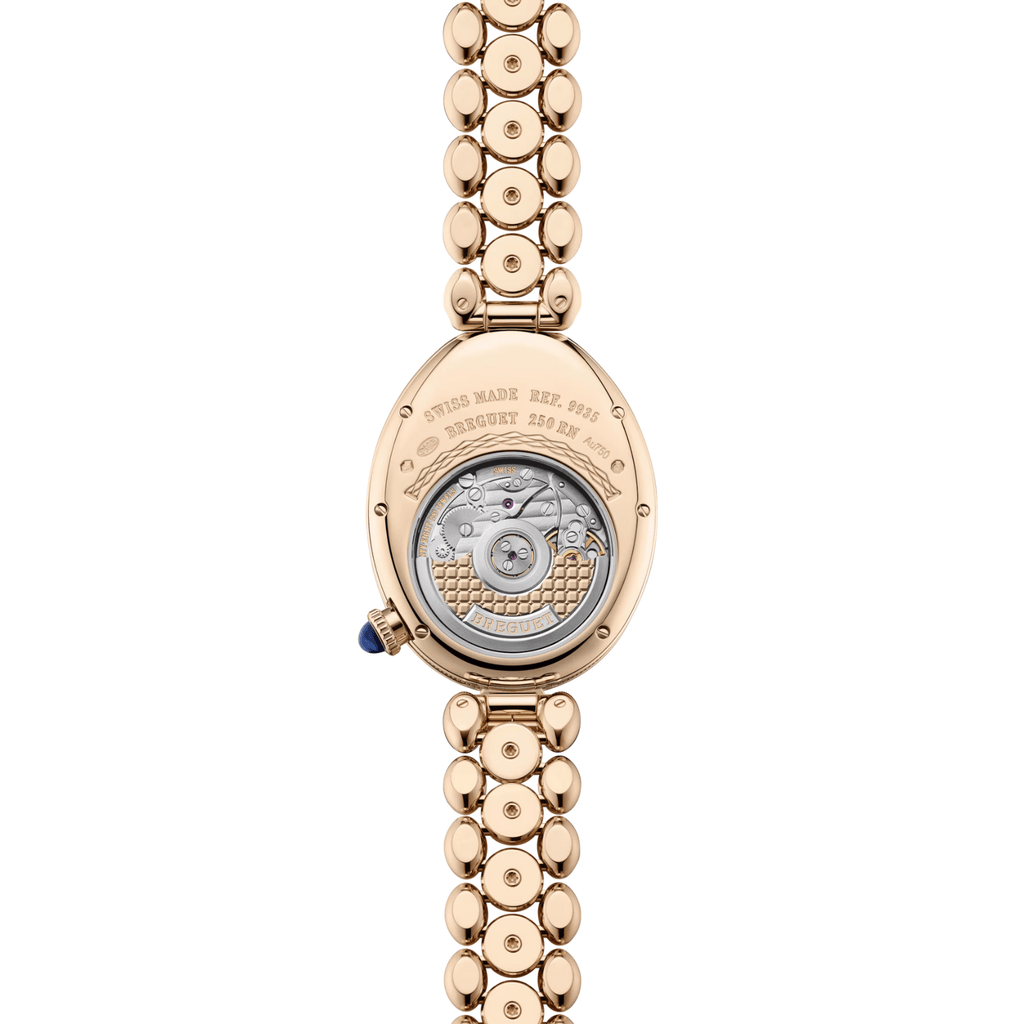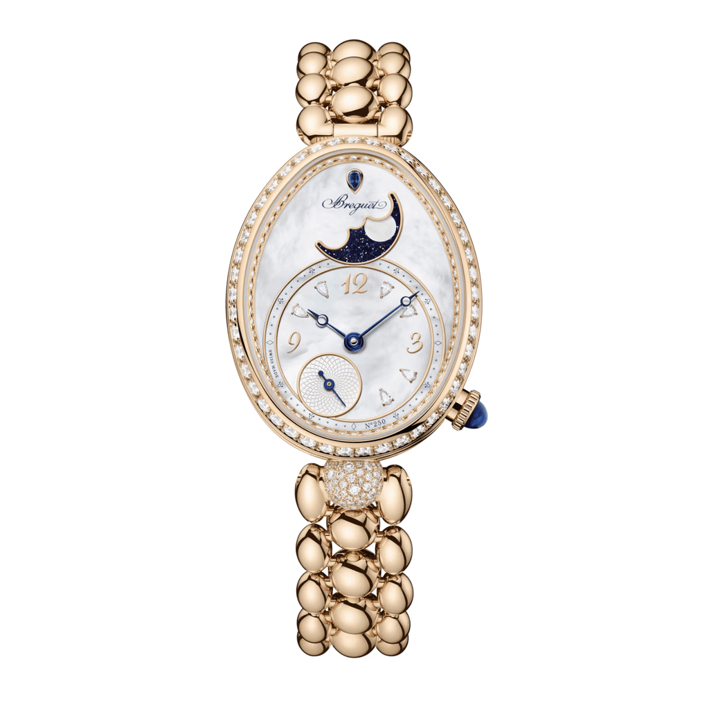This timepiece features a 28mm case crafted from 18K Breguet gold with a delicate mother-of-pearl dial. It offers water resistance up to 3 bar and is paired with. Equipped with small seconds and moon phase complications, it houses an automatic movement with a 45-hour power reserve. Breguet gold bracelet