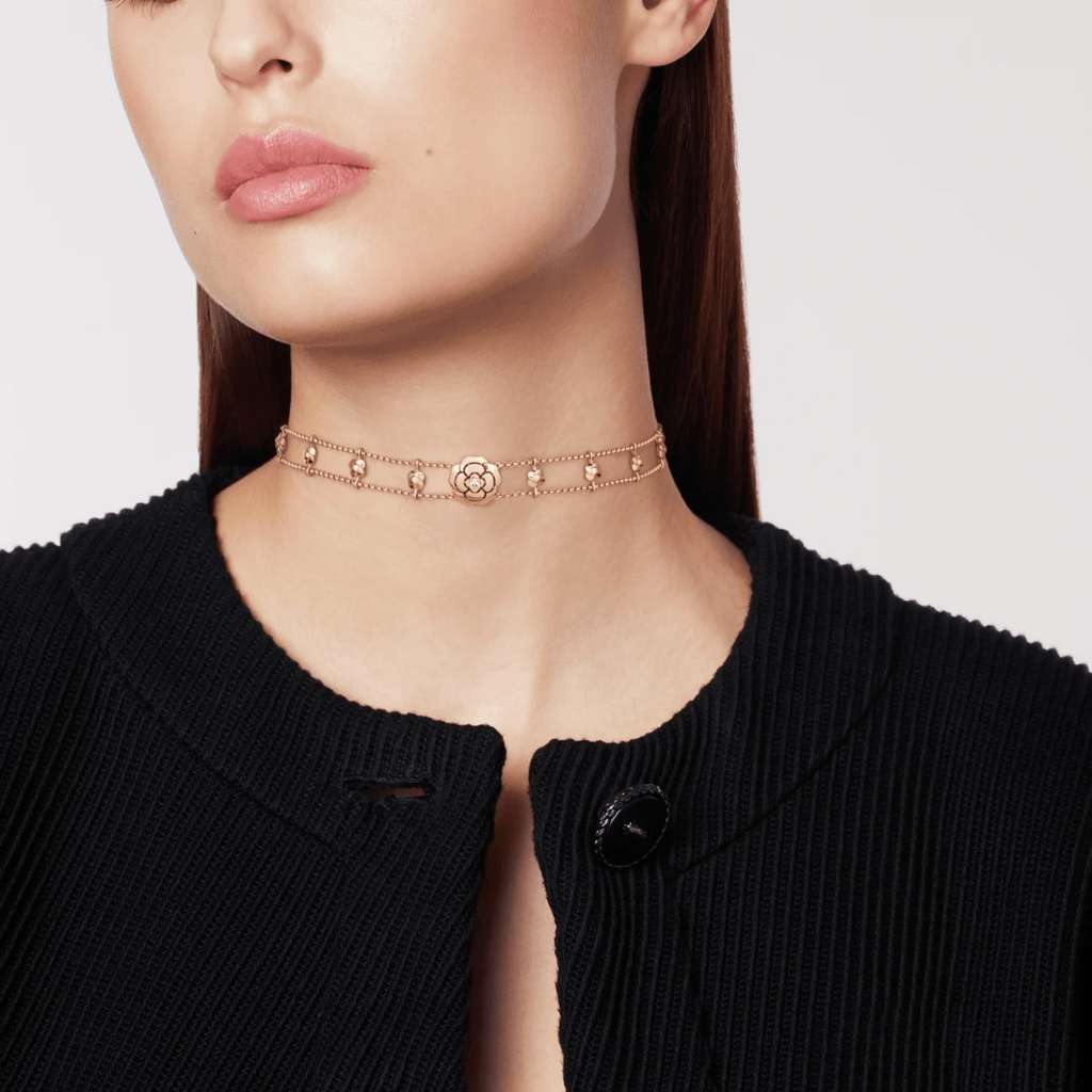 CHANEL Extrait De Camélia Supple Choker in 18K rose gold with diamonds totaling of 0.09 carats.