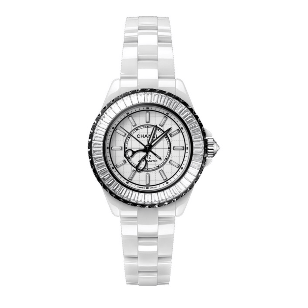 33mm white ceramic case with diamond-set bezel, white dial with diamond-set markers. White ceramic bracelet